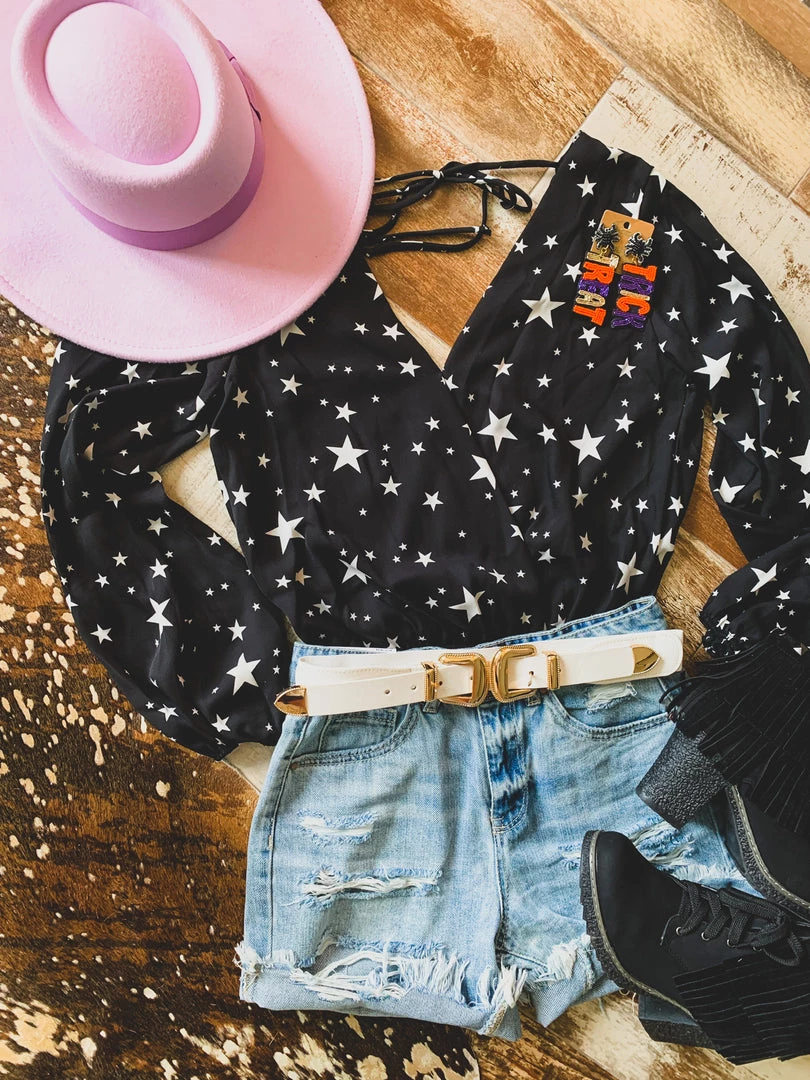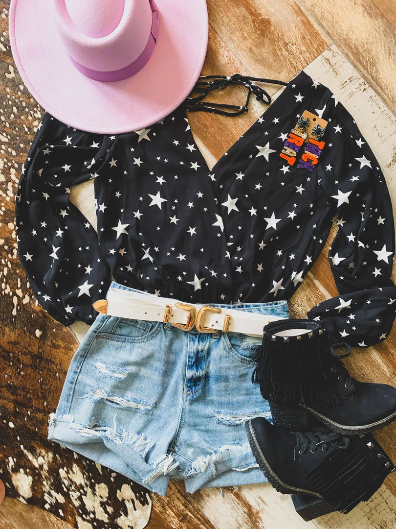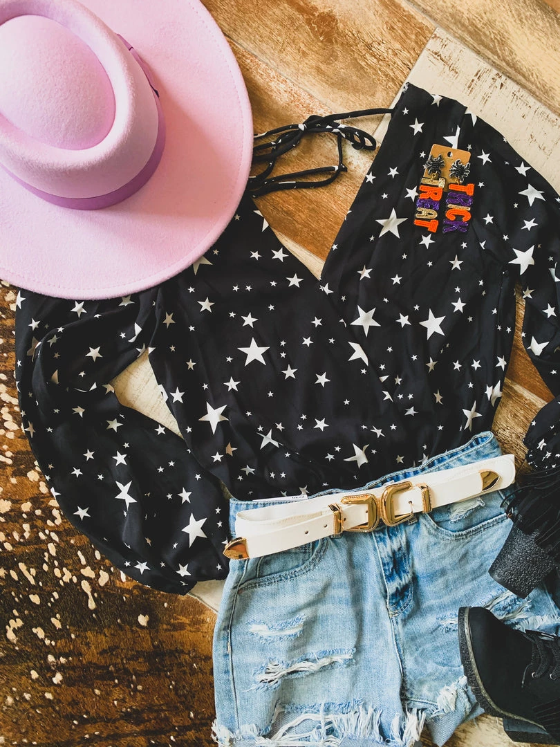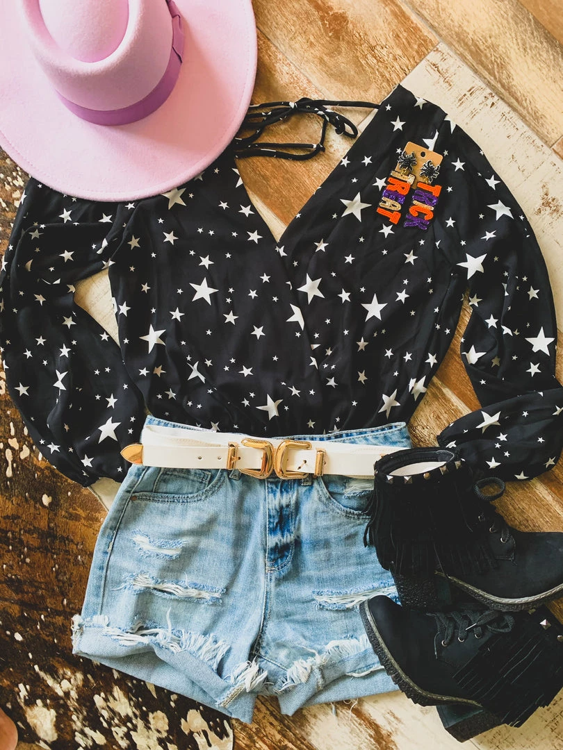 Black bodysuit features white stars, long sleeves, elastic cuffs, deep v-neckline, deep v-back with a back tie, and button snap closure. Bodysuit is so classy, fun, and perfect with denim!