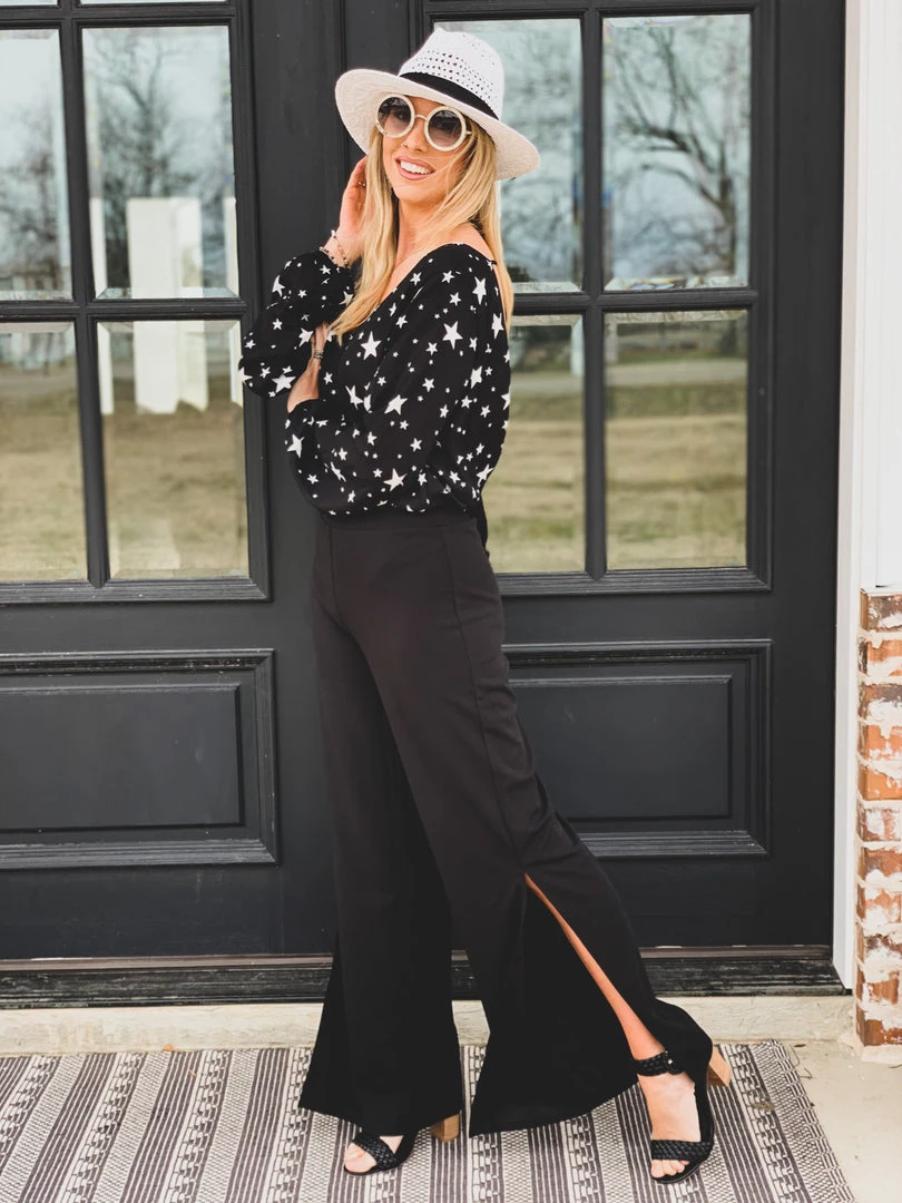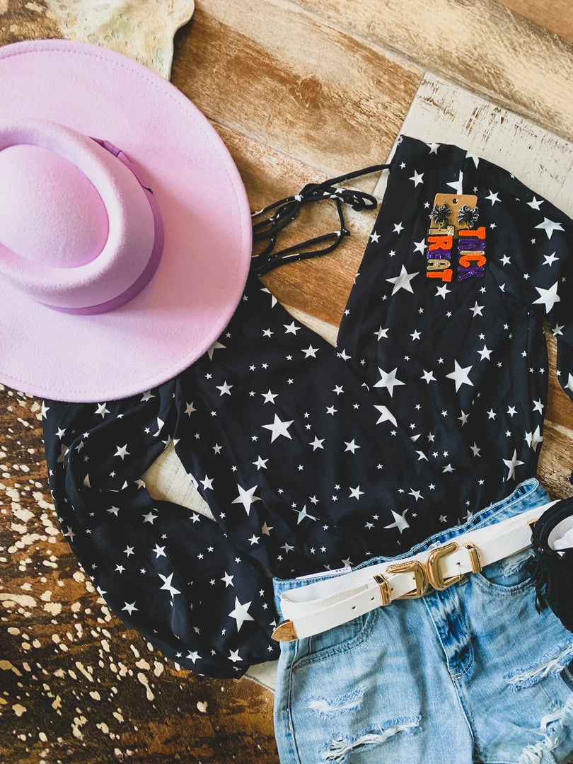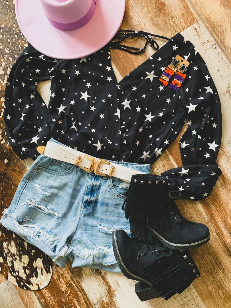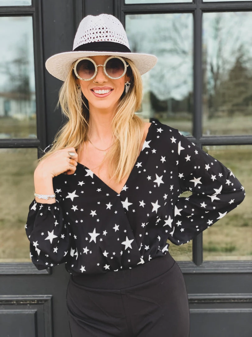 Black bodysuit features white stars, long sleeves, elastic cuffs, deep v-neckline, deep v-back with a back tie, and button snap closure. Bodysuit is so classy, fun, and perfect with denim!