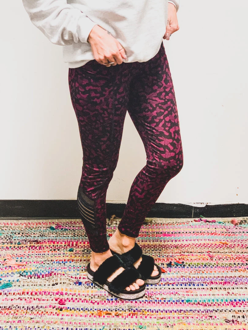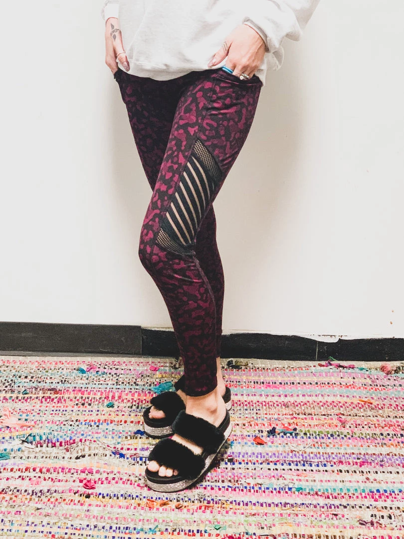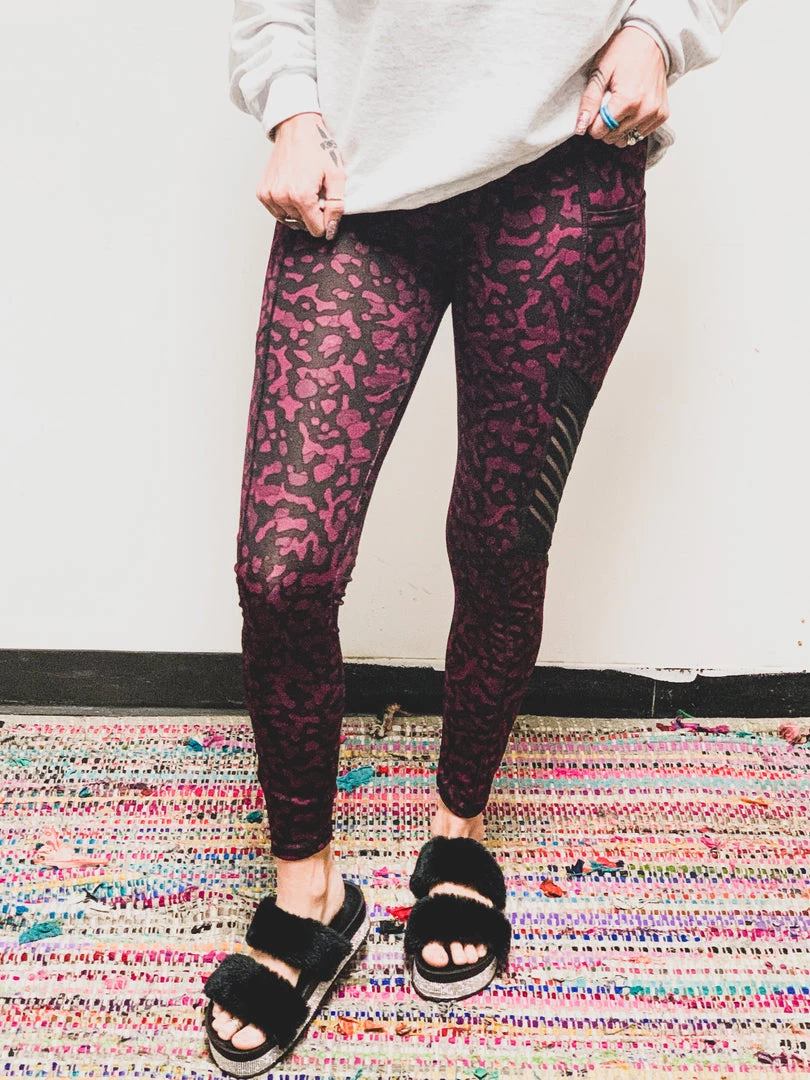 Fuchsia leopard print leggings are stretchy, soft, and so cute. Leggings are perfect for working out and lounging around while still looking CUTE! Leggings feature a thick elastic waistband, side pockets perfect for your phone, and mesh detail on each side of the leg. Pair with your favorite oversized graphic tees, sherpas, or sweatshirts!Â