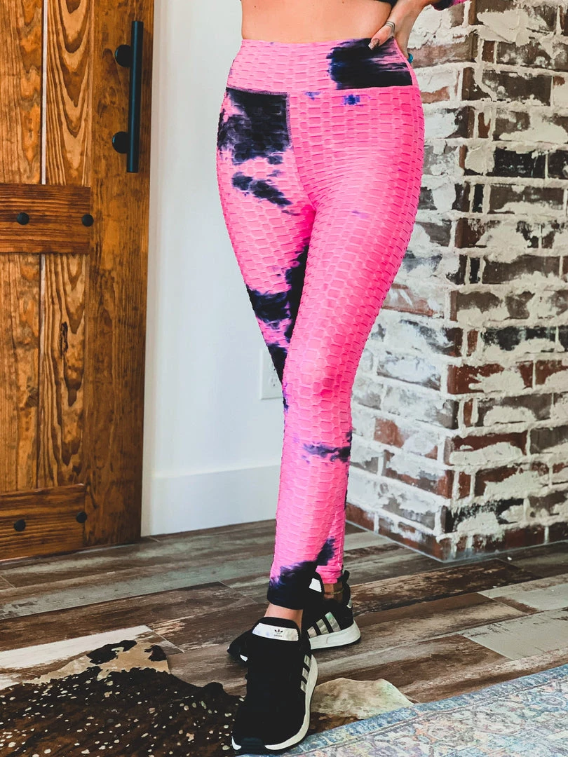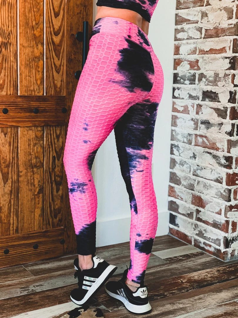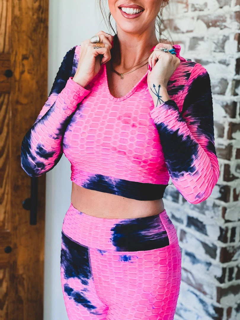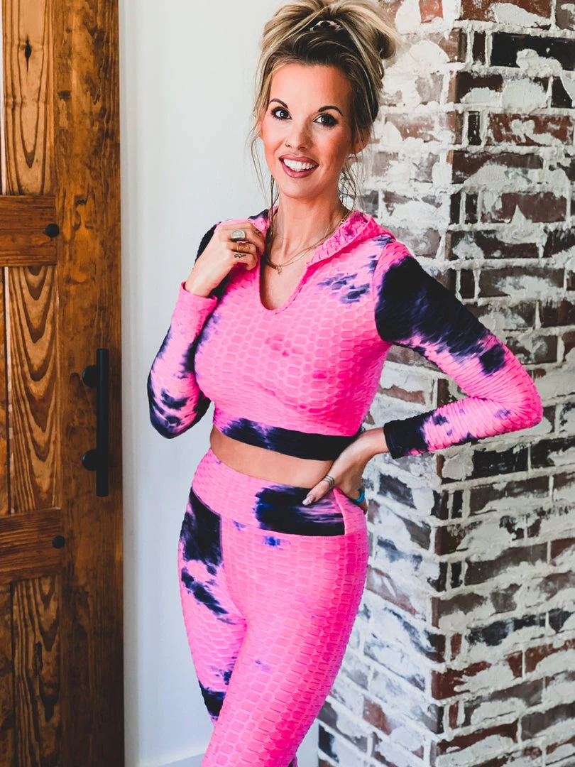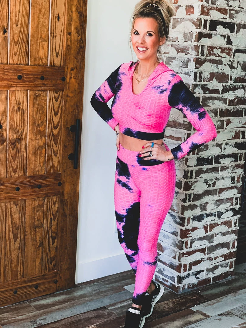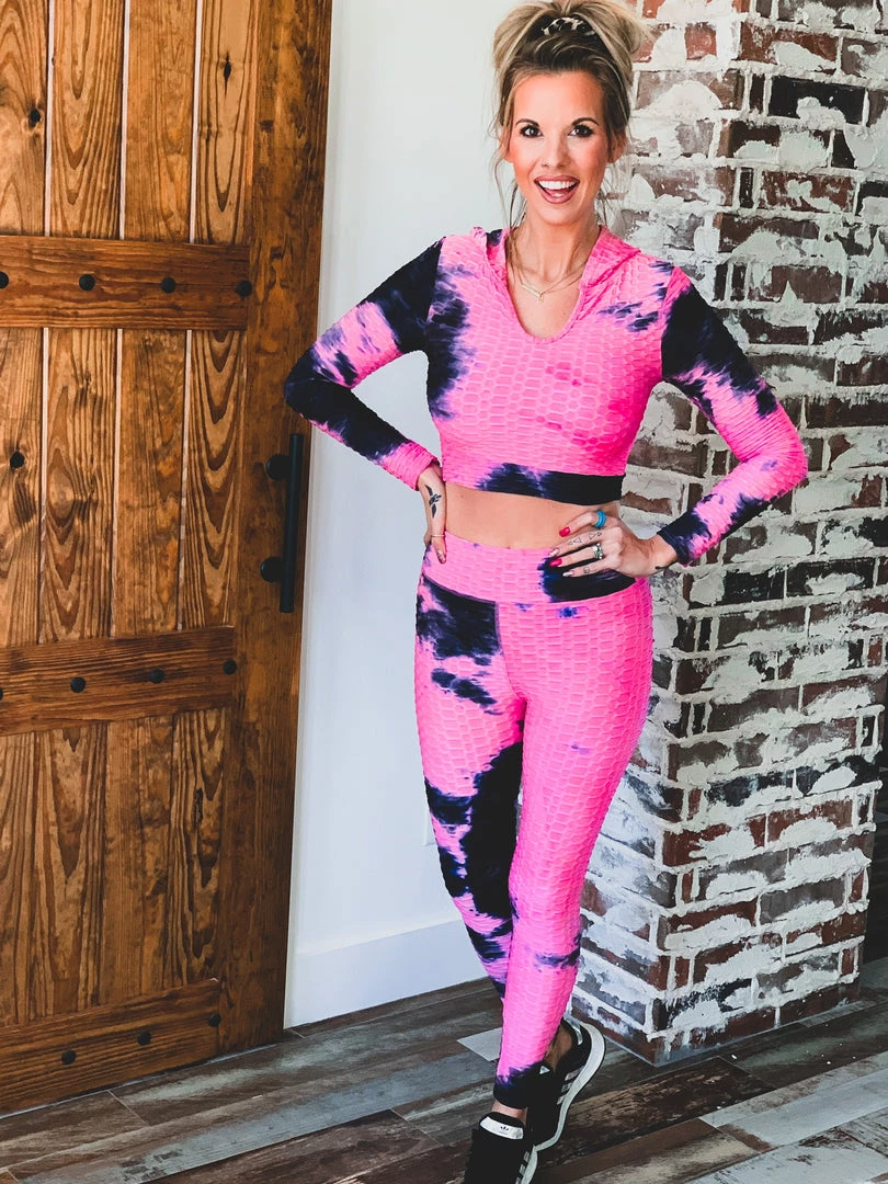 Pink tie dye scrunch two piece set is perfect for all your comfy days. Set features high waisted scrunch leggings and a fitted long sleeve hooded top with crop length. Perfect for work outs, comfy day, and running errands!Â