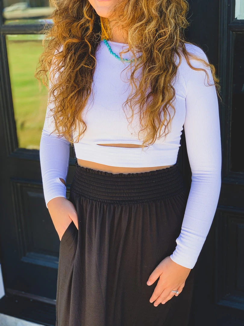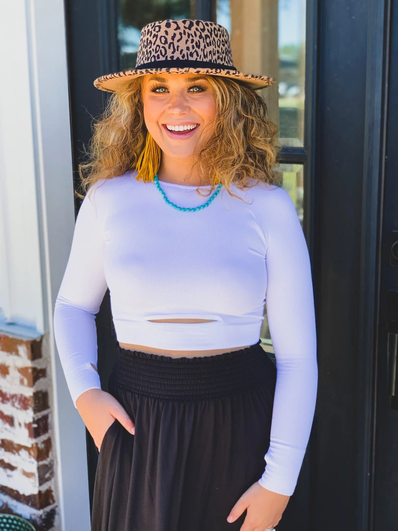 One size classic white long sleeve crop top is a our new favorite go to! Features a trendy ribbed texture, a crew neckline, fitted long sleeves with thumb hole detail, a cropped length with a thick elastic band, and the cutest cut out stomach detail. And don’t even get us started on the BUTTERY soft, thick, and stretchy material – it’s literally amazing! The perfect top to pair under all your flannels, shackets, and cardigans!