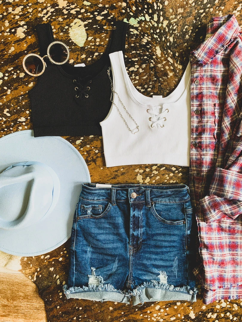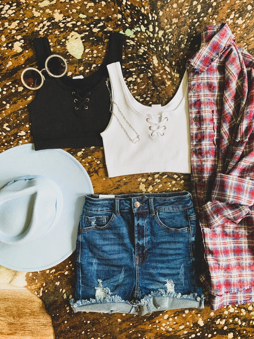 Ribbed brami is so cute paired with all your workout leggings, denim, and even underneath your favorite flannel. Crop top brami features lace up front detail (non adjustable), spaghetti straps, a super stretchy material, and a cropped length – *right under the bust.* These are a must for the Summer!