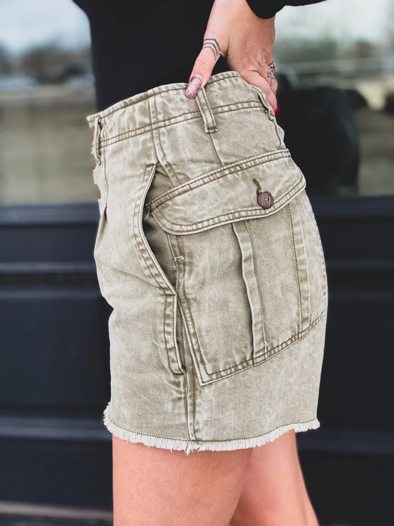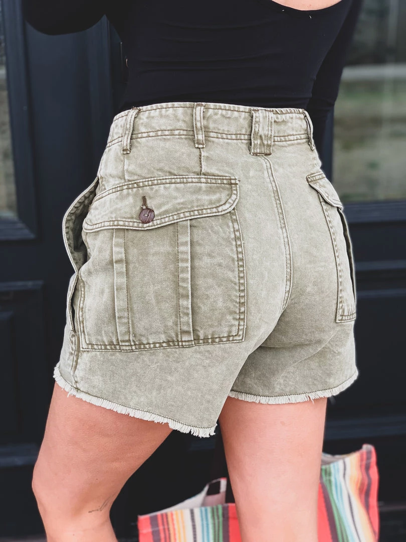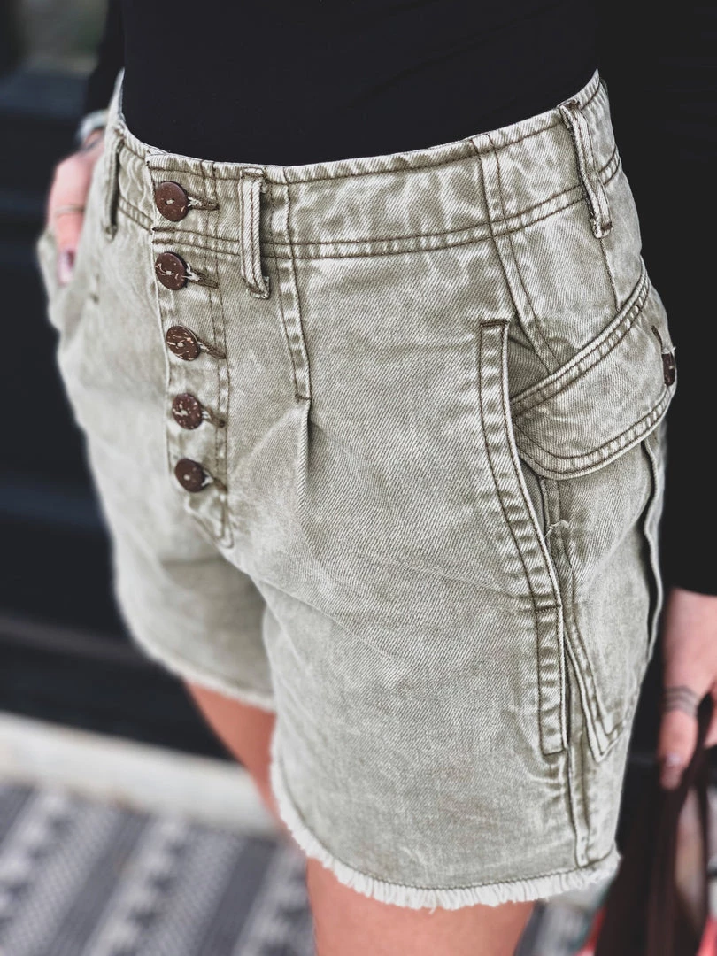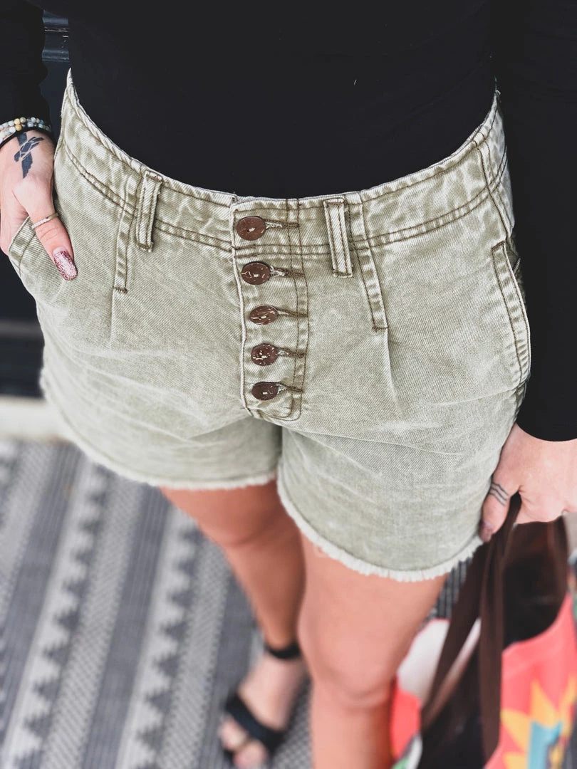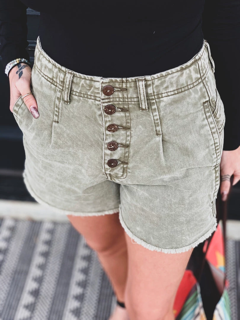 Olive denim shorts with a faded mineral wash are a must have this Summer! Shorts feature a five button fly, a longer length, high waist, two side pockets, two back flap button pockets placed slightly on the hips, and a raw cut hem. Gypsy Waltz is OBSESSED! Pair with all your favorite bodysuits this Summer!