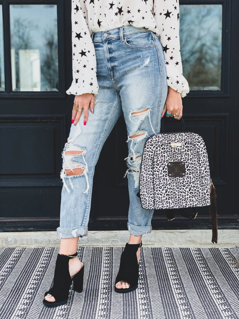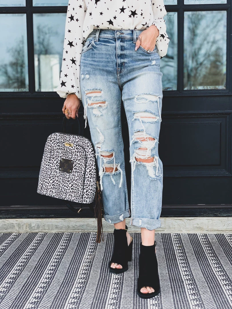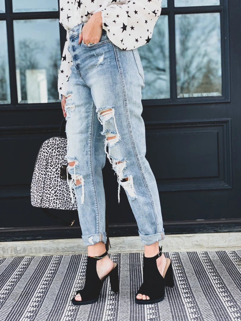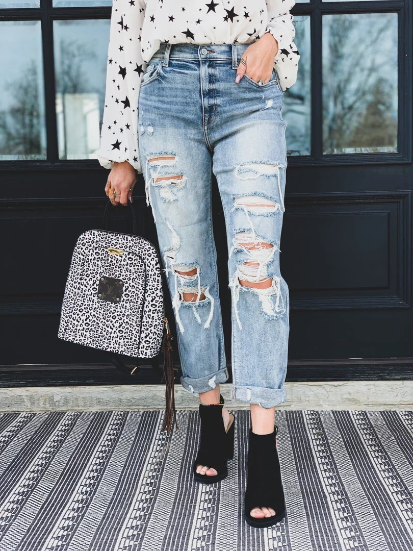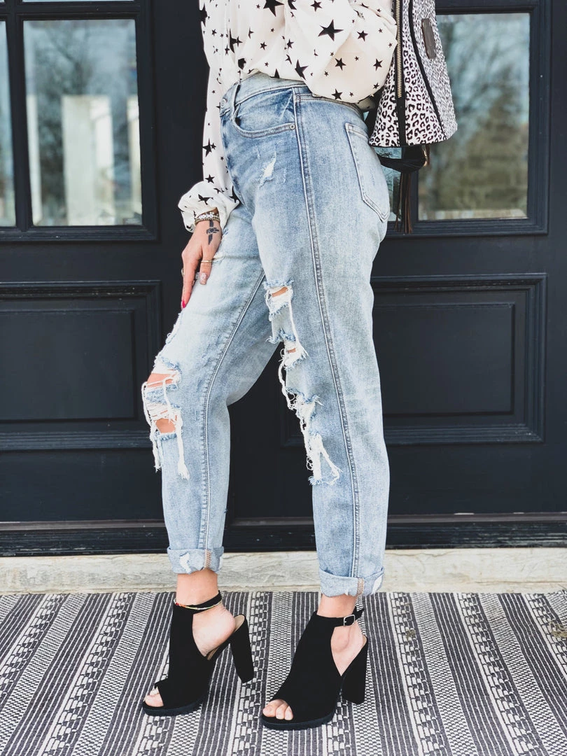 Light wash distressed denim high-waist boyfriend fit denim pant are the perfect GO TO jean. Pants feature a traditional front button and zipper closure, two front pockets, and two back pockets. Jeans have a heavier distressing on the thigh, the knees, and distressing on the ankle cuff . SO comfy, cute, and a must have in your closet! Wow, these skinnies are EVERYTHING!Â