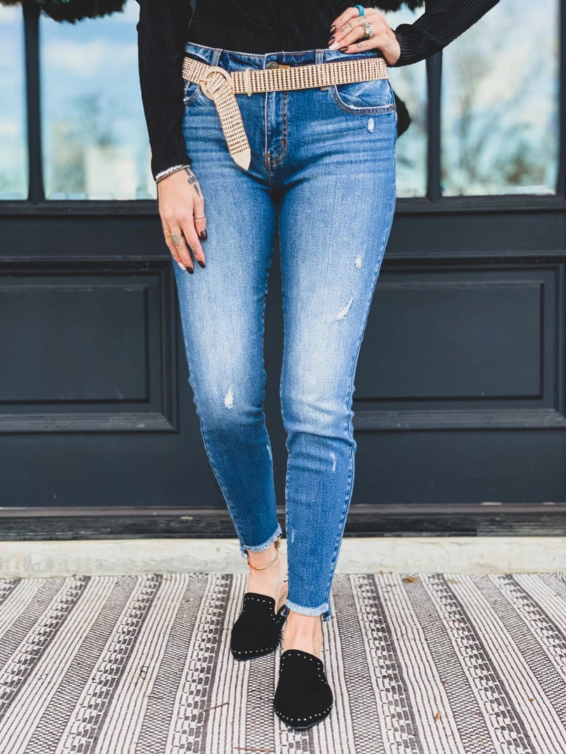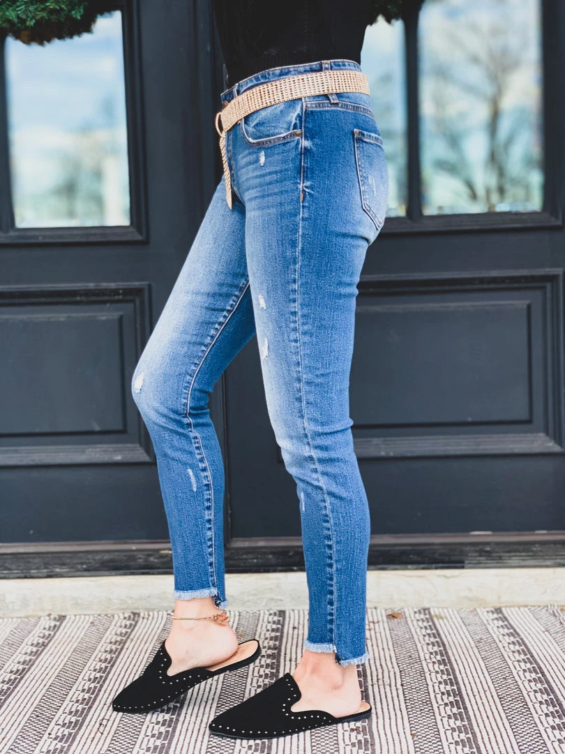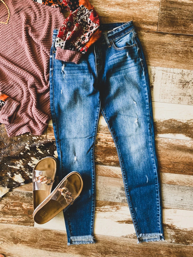 Medium washed mid rise denim skinnies are the perfect go-to jean! Pants feature a flattering comfy fit, traditional button and zipper closure, two front pockets, two back pockets, very light distressing, and an uneven cut raw frayed hem. Jeans are stretchy soft denim with a faded look on the thigh and butt of the pants. Such a good go-to denim! Looks perfect paired with our Queen City Bodysuits!