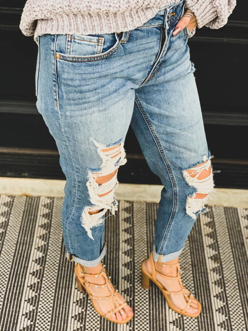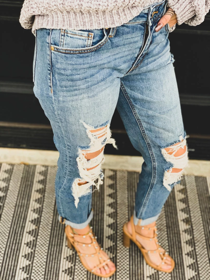 Medium wash distressed denim high-waist boyfriend fit denim pant are the perfect GO TO jean. Pants feature a traditional front button and zipper closure, two front pockets, and two back pockets. Jeans have a heavier distressing on the thigh down pass the knees. SO comfy, cute, and a must have in your closet! Wow, these skinnies are EVERYTHING. A new Gypsy Waltz staff FAV!
