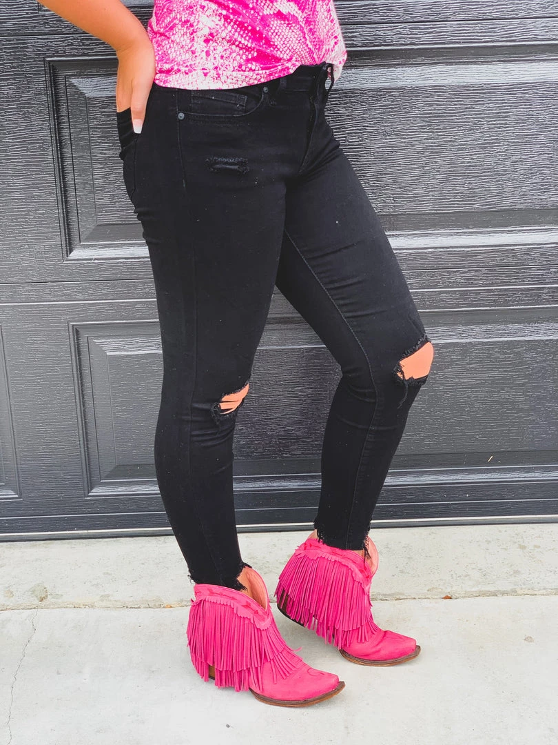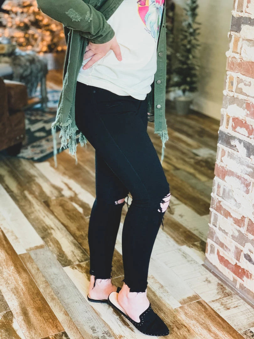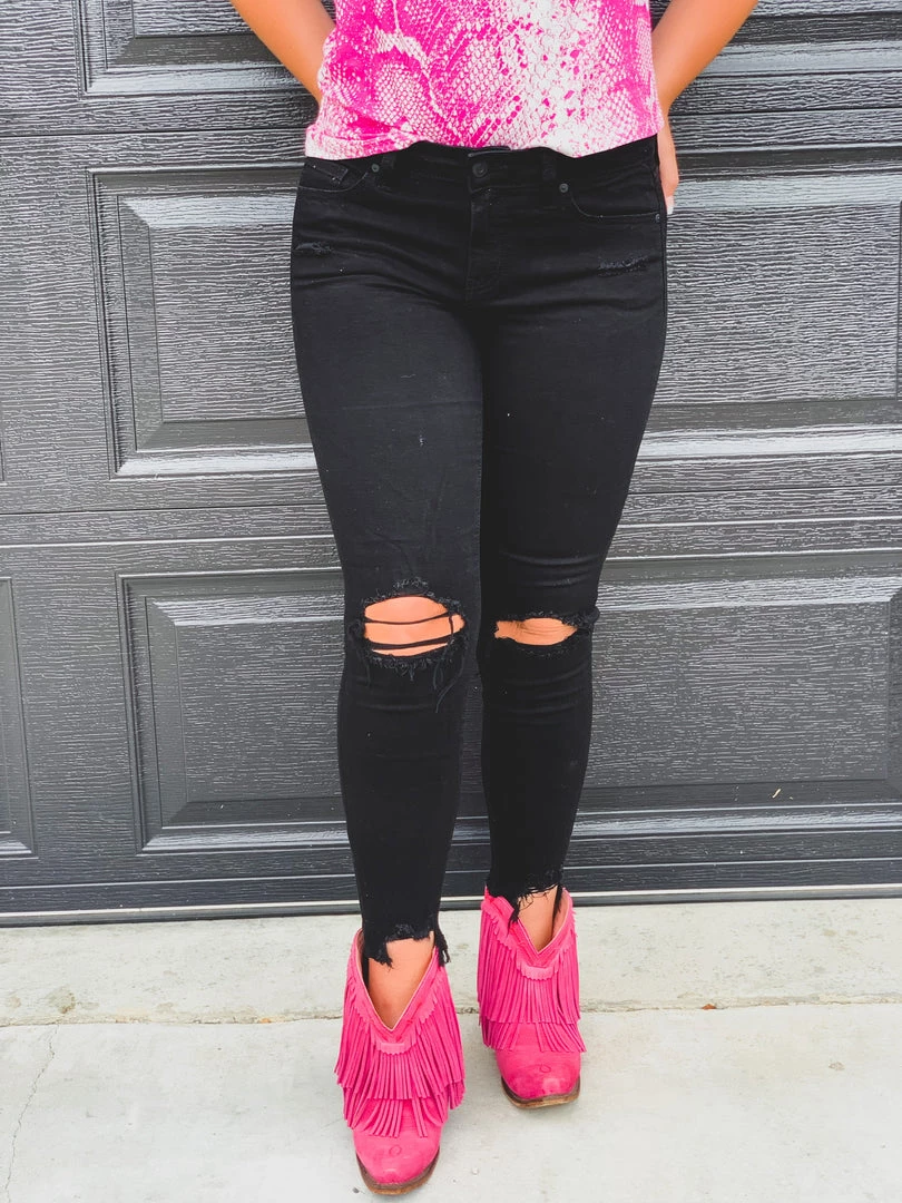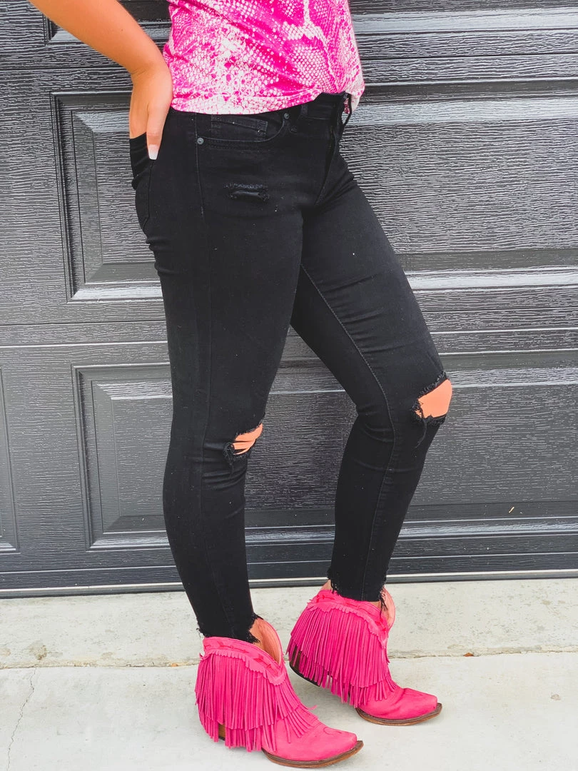 Black mid rise skinny crop pants are stretchy, comfortable, and the perfect go to jean. Skinnies feature a traditional button and zipper closure, two front pockets, two back pockets, distressing at the knee, and a raw cut hem. Such a soft and stretchy denim that looks perfect paired with any top!