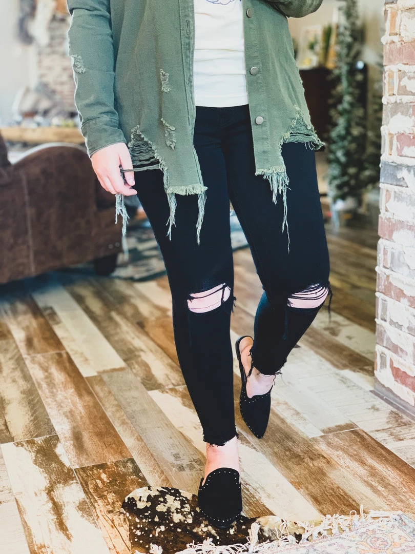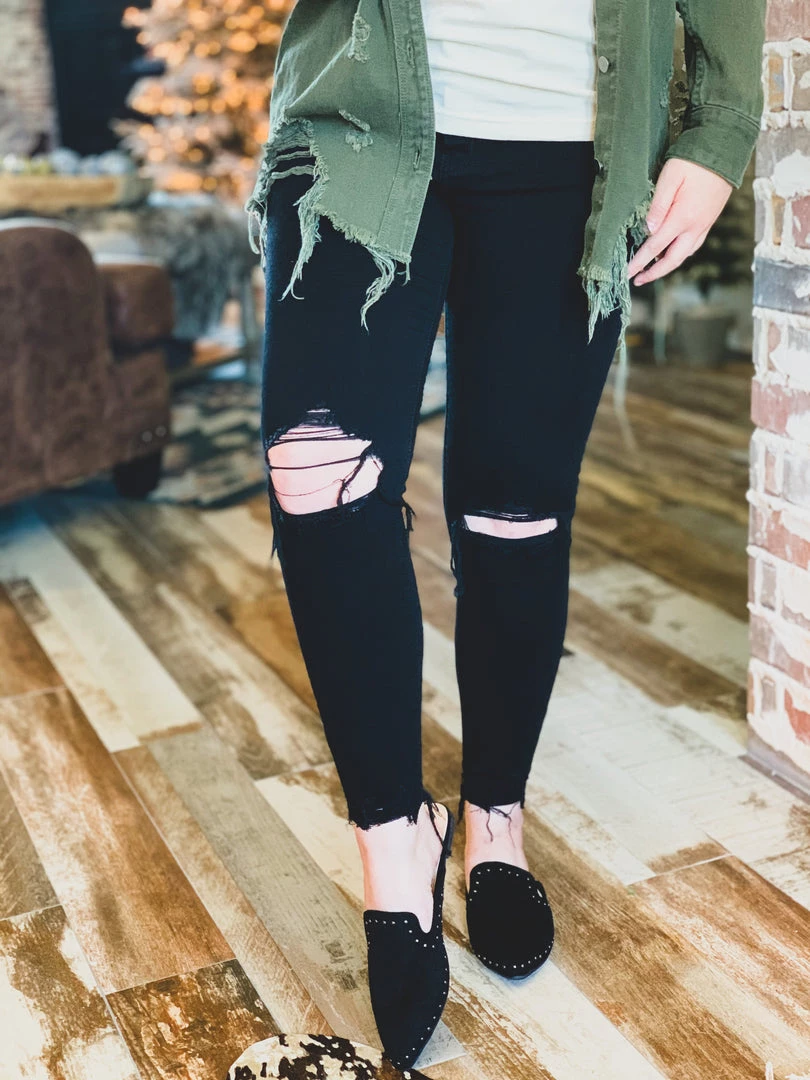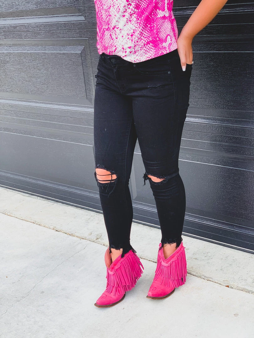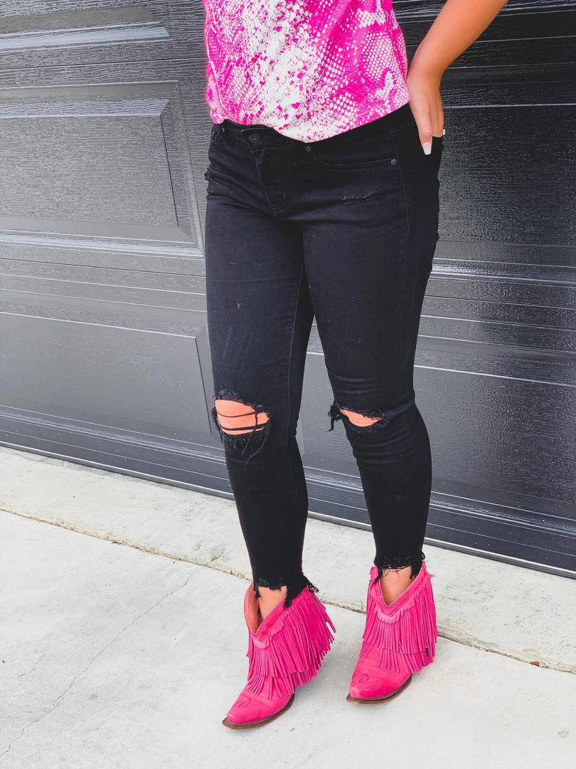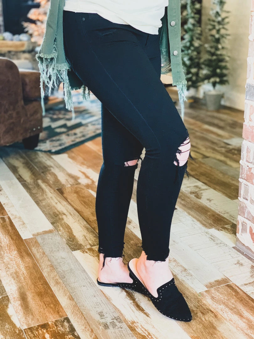 Black mid rise skinny crop pants are stretchy, comfortable, and the perfect go to jean. Skinnies feature a traditional button and zipper closure, two front pockets, two back pockets, distressing at the knee, and a raw cut hem. Such a soft and stretchy denim that looks perfect paired with any top!