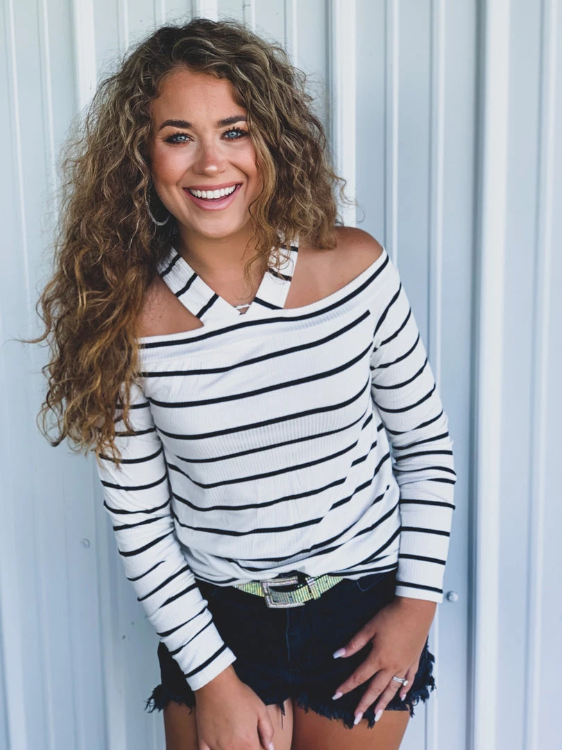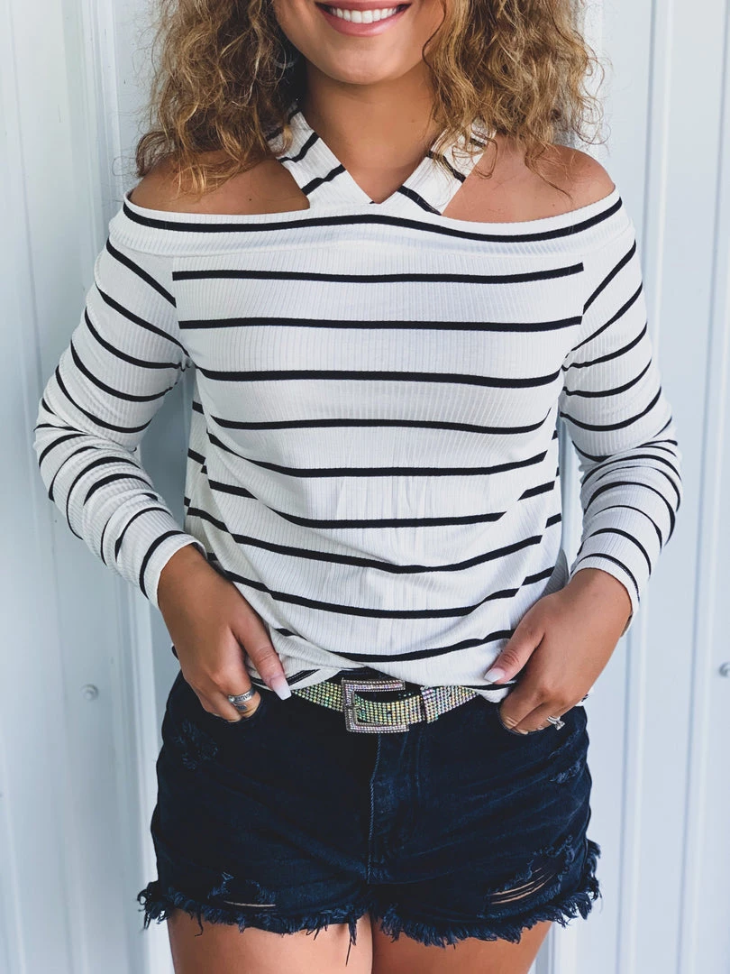 The perfect top for any occasion. Features a trendy black and white horizontal stripe pattern, long sleeves, a ribbed knit light weight material, cold/off shoulder look, and a halter neck design. Such a cute got to top for all your shorts and jeans!