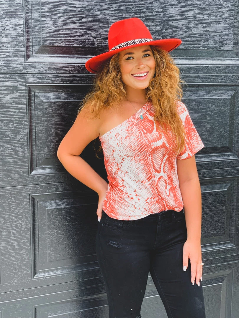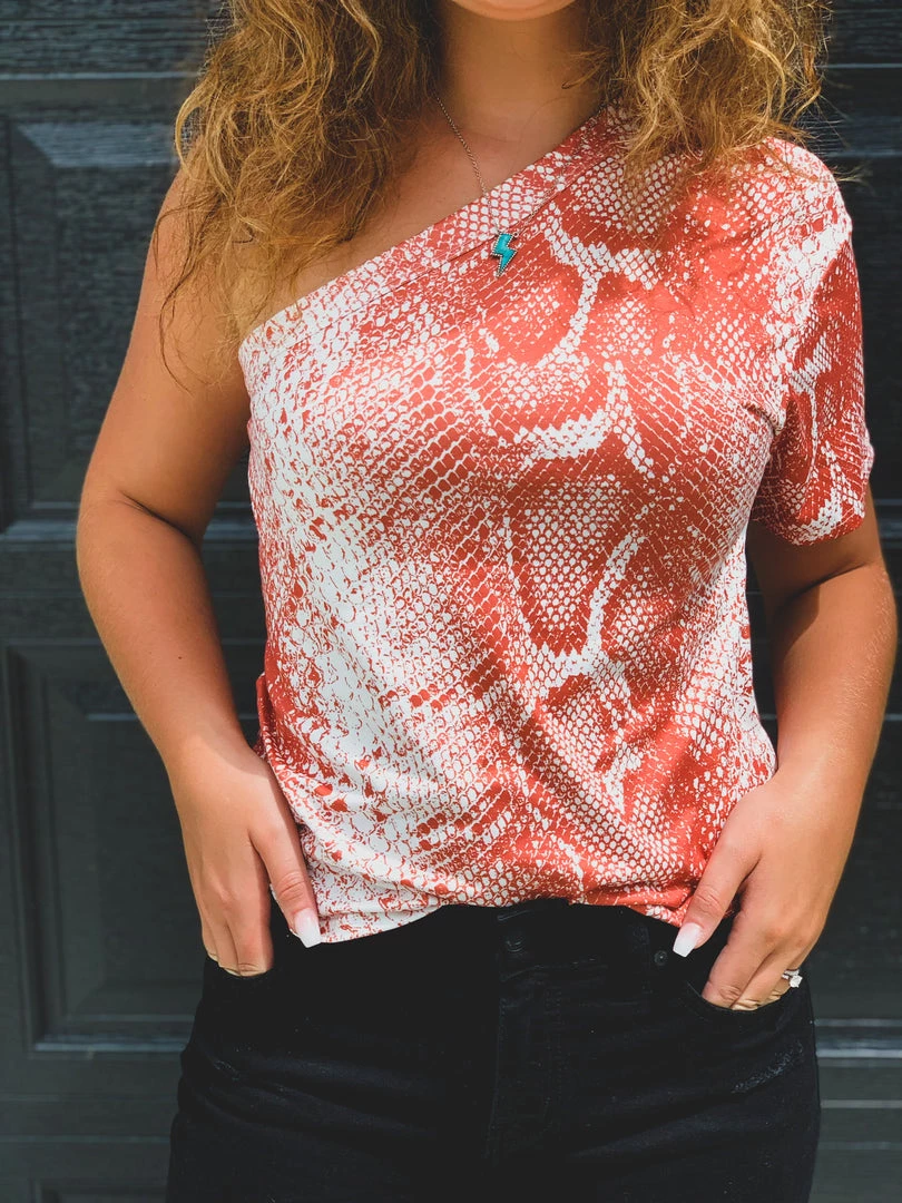Rust colored snake print asymmetrical one shoulder top is a wardrobe must. Top features an short sleeve one shoulder style, with an off shoulder style, trendy rust colored snake print pattern, and a light weight breathable buttery soft material. Pair with our Nocona Pants, Bogata Studs, and Elkhart Necklace for the completed look!