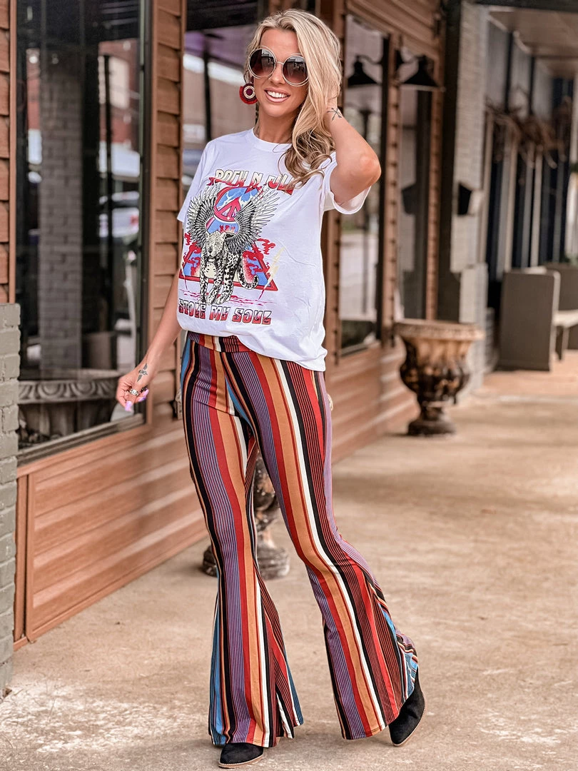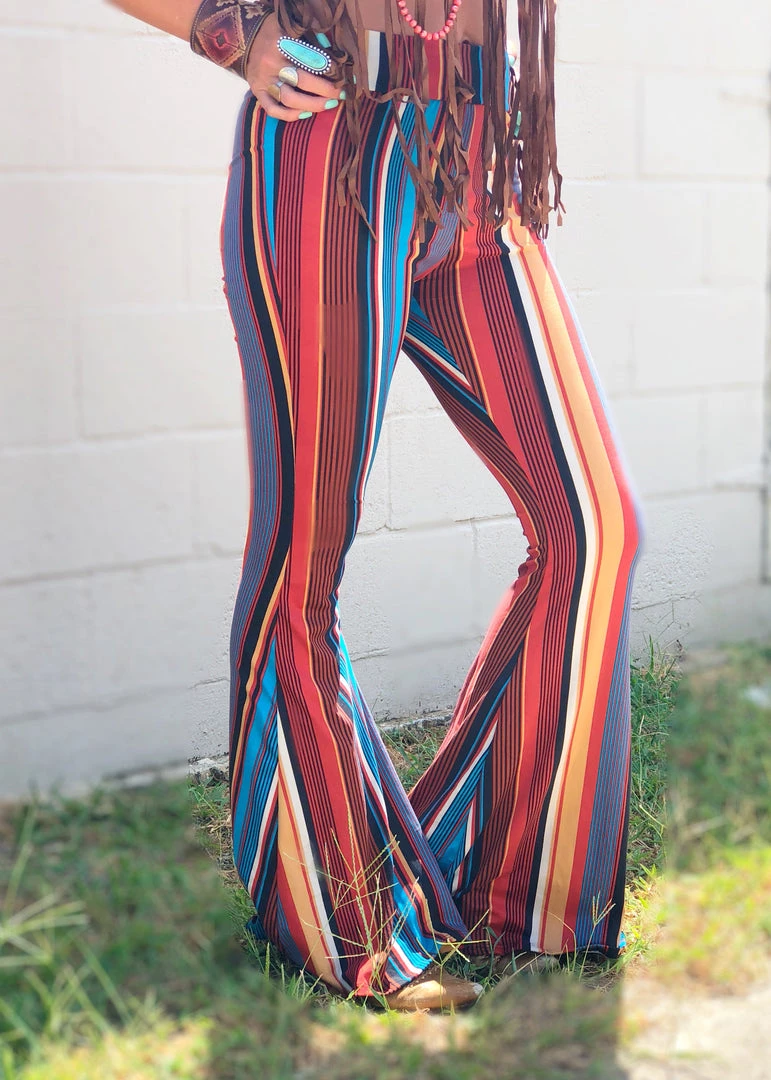 Turquoise and brown striped fitted flare super soft bell bottoms. Features an elastic waistband. Pair these bottoms with our brown fringe crop top for the perfect look!