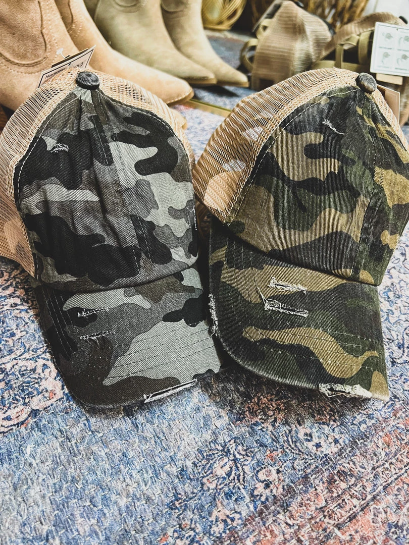 Distressed GREEN camo or GRAY camo ball cap with a criss cross mesh back for the perfect high pony. Cap is great for all those messy hair days, rainy days, or mornings you snooze your alarm one too many times.