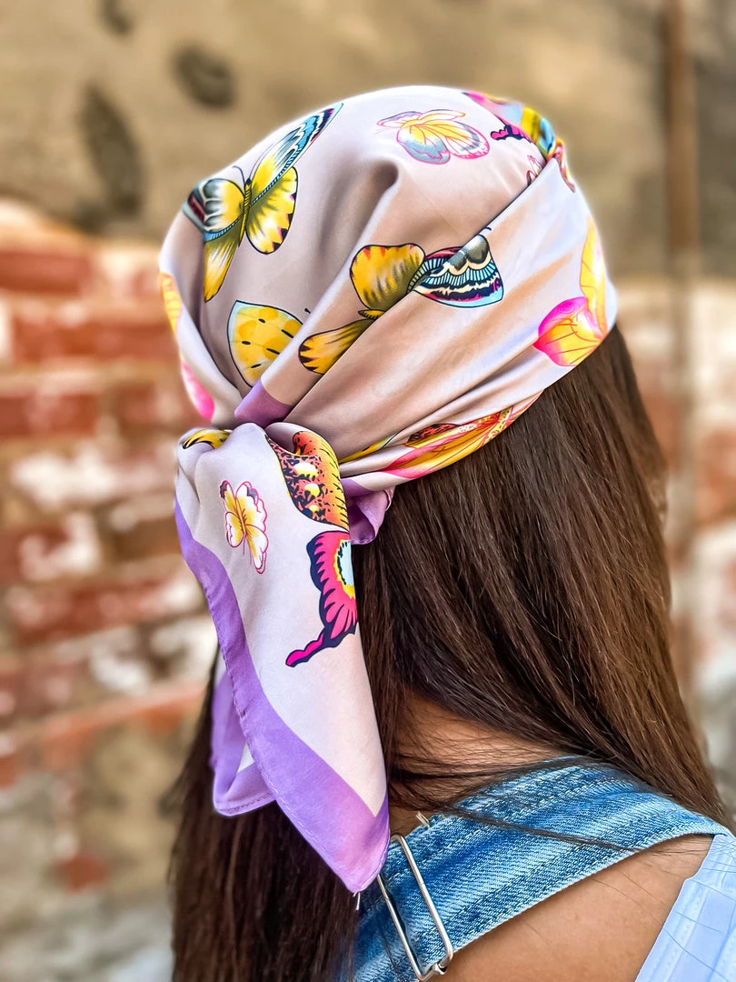 Purple multi color butterfly print silk wild rag is the perfect all around accessory. Purple colorful butterfly print with a beautiful silky shine. Tie it around your wrist, belt loop, in your hair as a head wrap, or wear it as a western wild rag around your neck. SO many different CUTE ways to incorporate this babe in your outfits. Stand out with our new bandana!