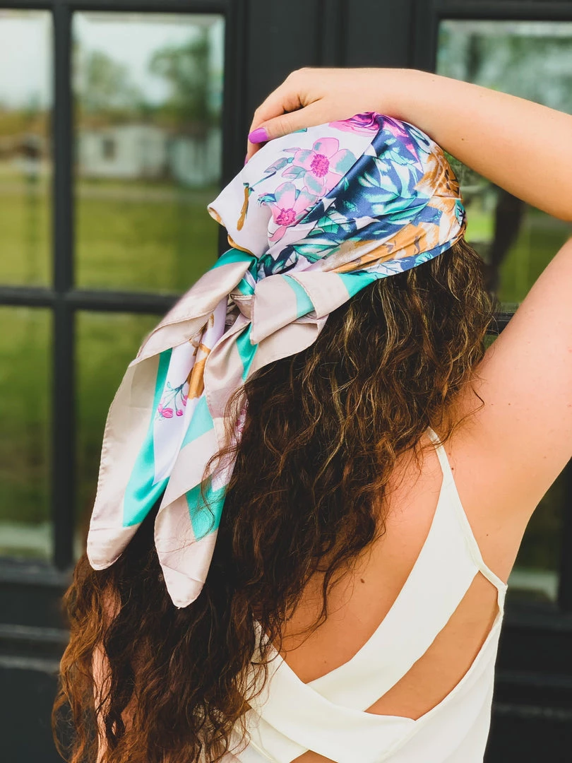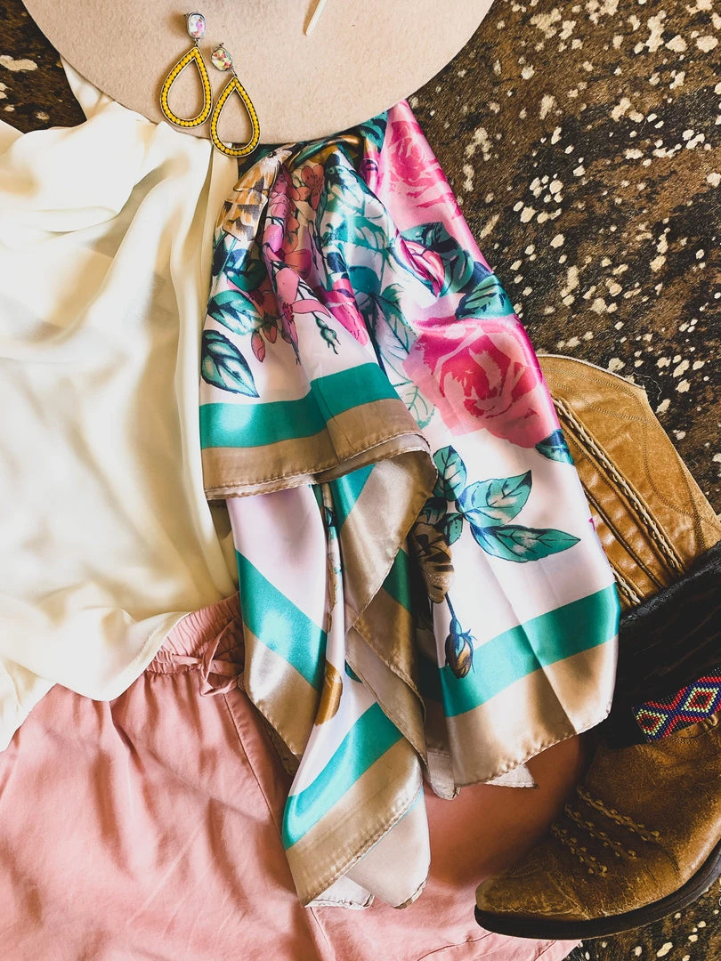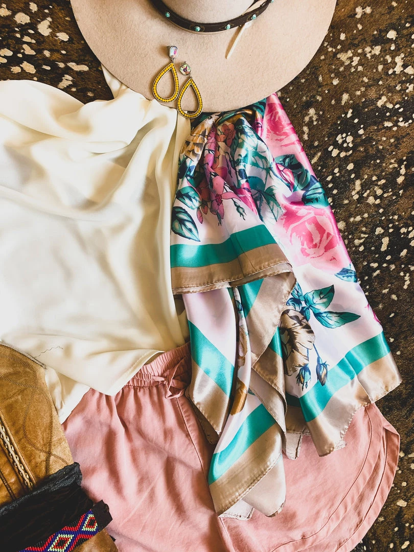 Champagne multi color floral print silk wild rag is the perfect all around accessory. Scarf features colors of champagne, turquoise, gold, and pink. Beautiful floral pattern with the perfect silky shine. Tie it around your wrist, belt loop, in your hair as a head wrap, or wear it as a western wild rag around your neck. SO many different CUTE ways to incorporate this babe in your outfits. Stand out with our new bandana!