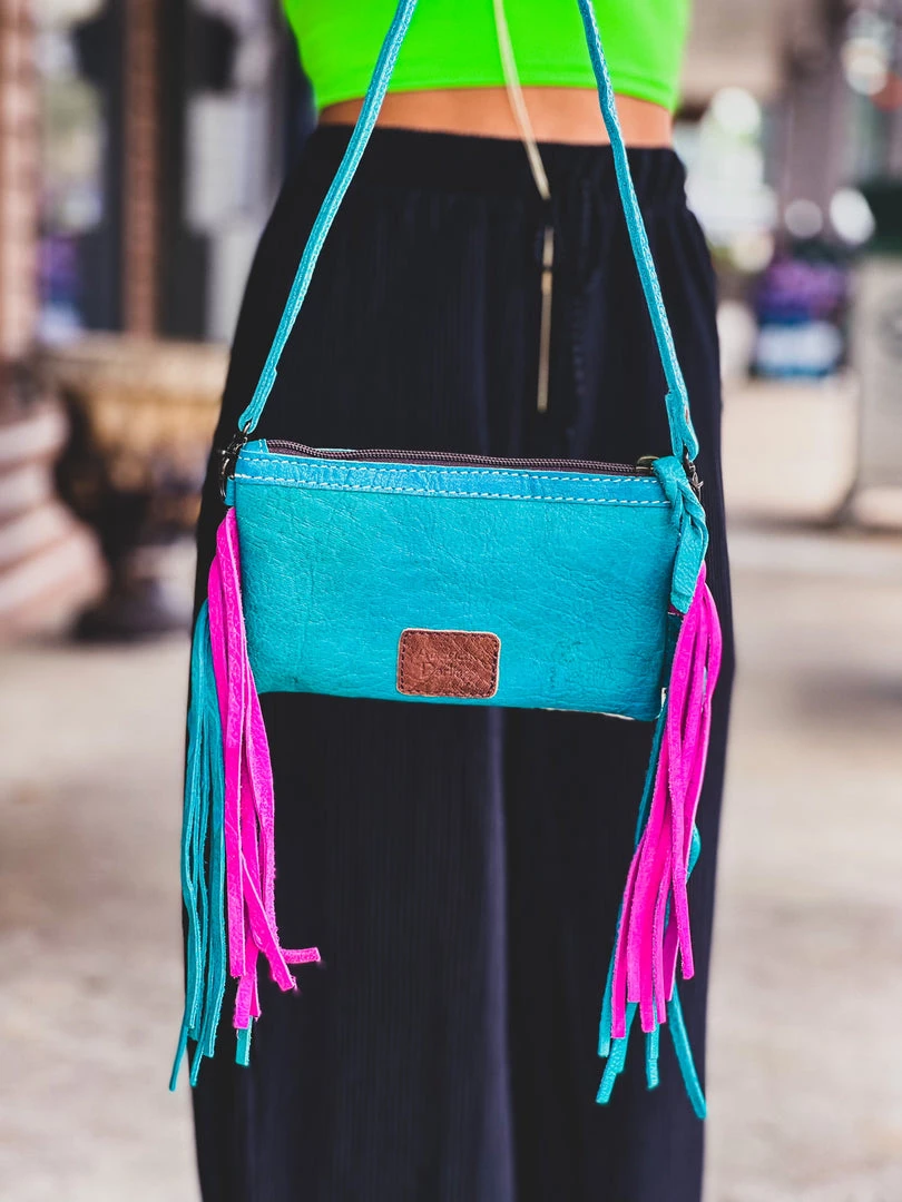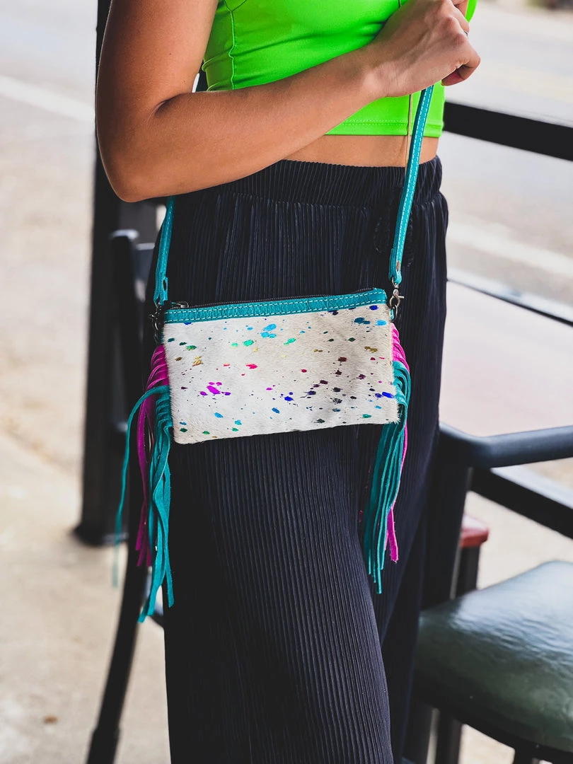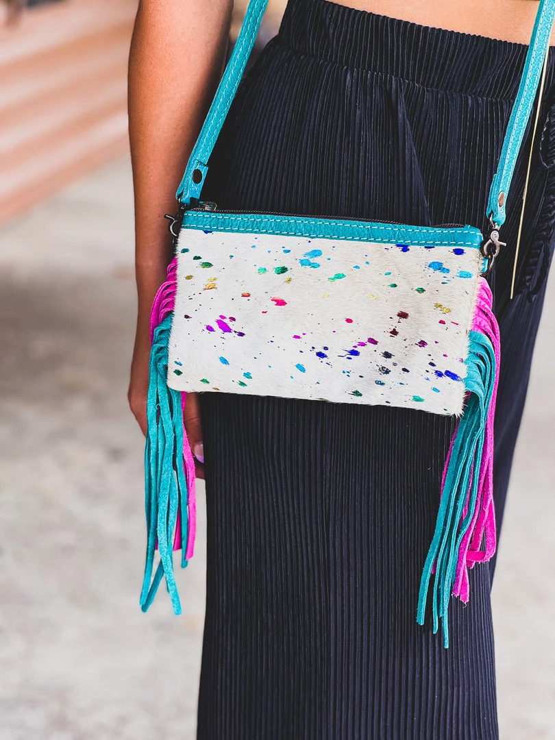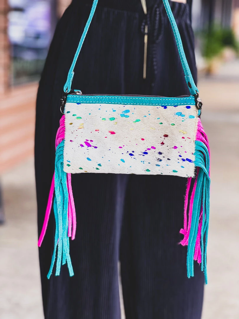 - Cream speckled cowhide front with rainbow acid wash, zipper top closure, turquoise leather back, adjustable and removable turquoise crossbody strap