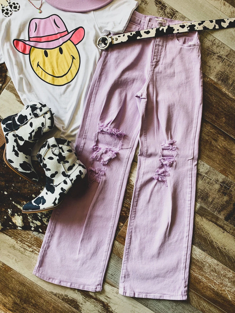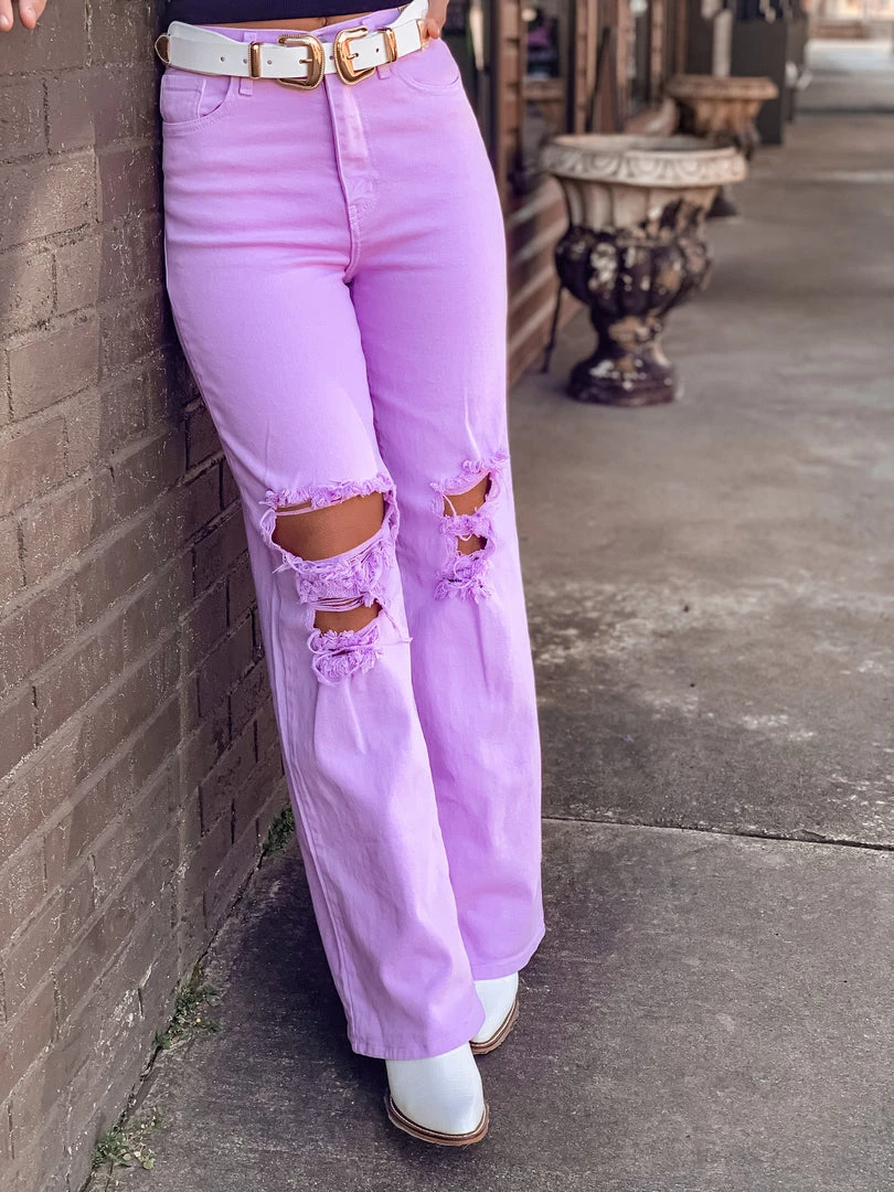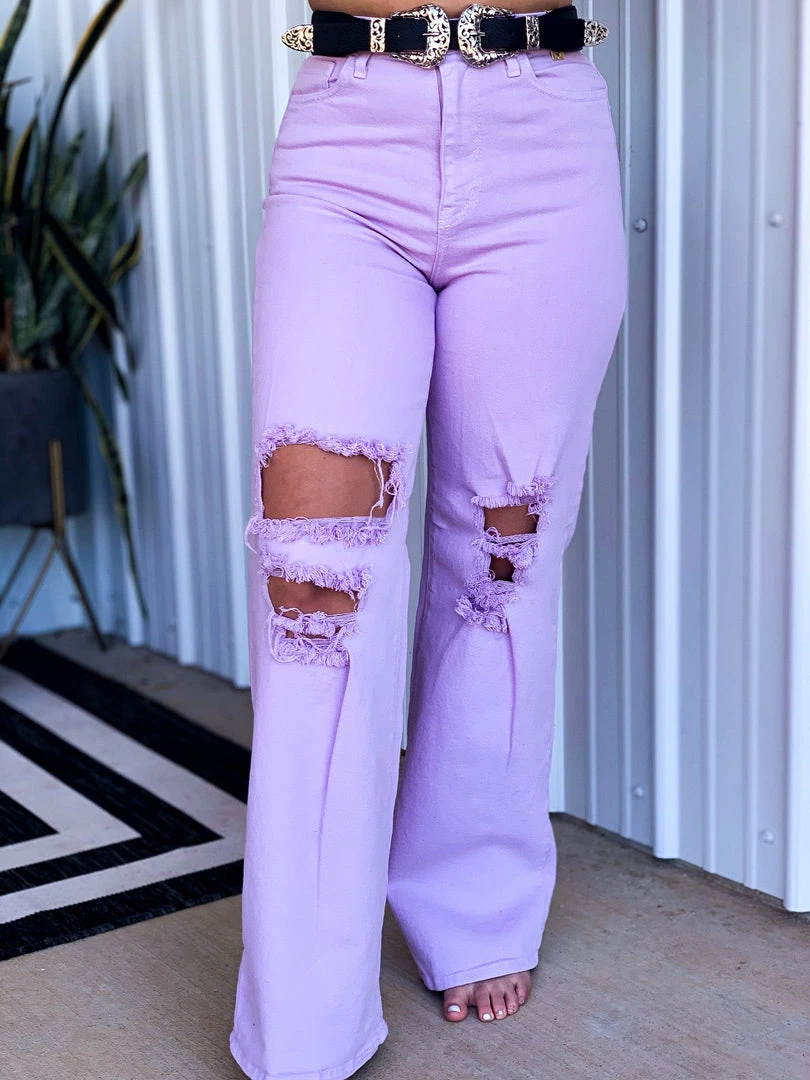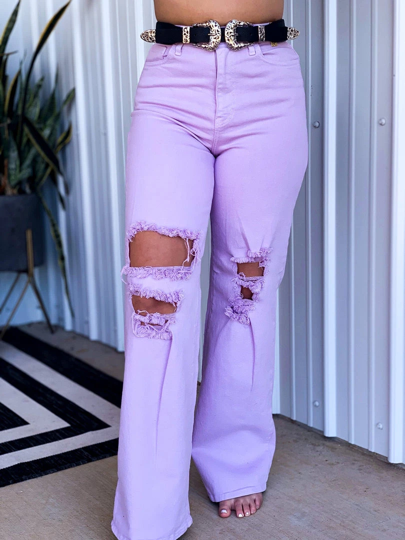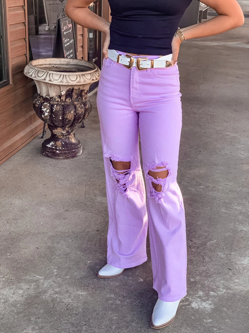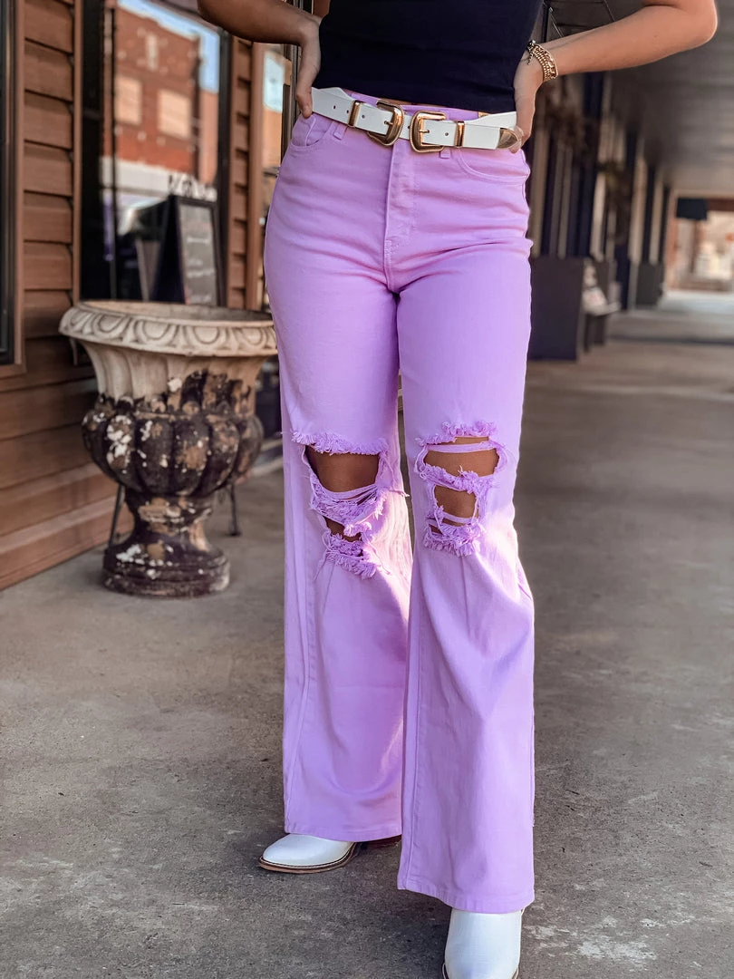 Gypsy Waltz staff FAVORITE! New LAVENDER colored denim flares got us OBSESSED. Features knee distressing, high-waisted, traditional front button and zipper closure, front pockets, back pockets, and a cute flared hemmed bottom. Jeans fit so flattering and have a good bit of stretch. SO 90’s denim retro and we LOVE it paired with our Aledo Pants, Sanger hat, Albany Belt, Converse Necklace, Ovilla Earrings, and Burton Booties for the complete look!