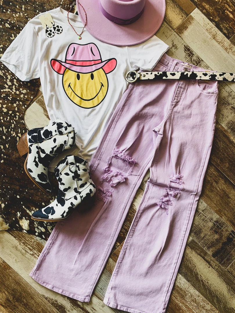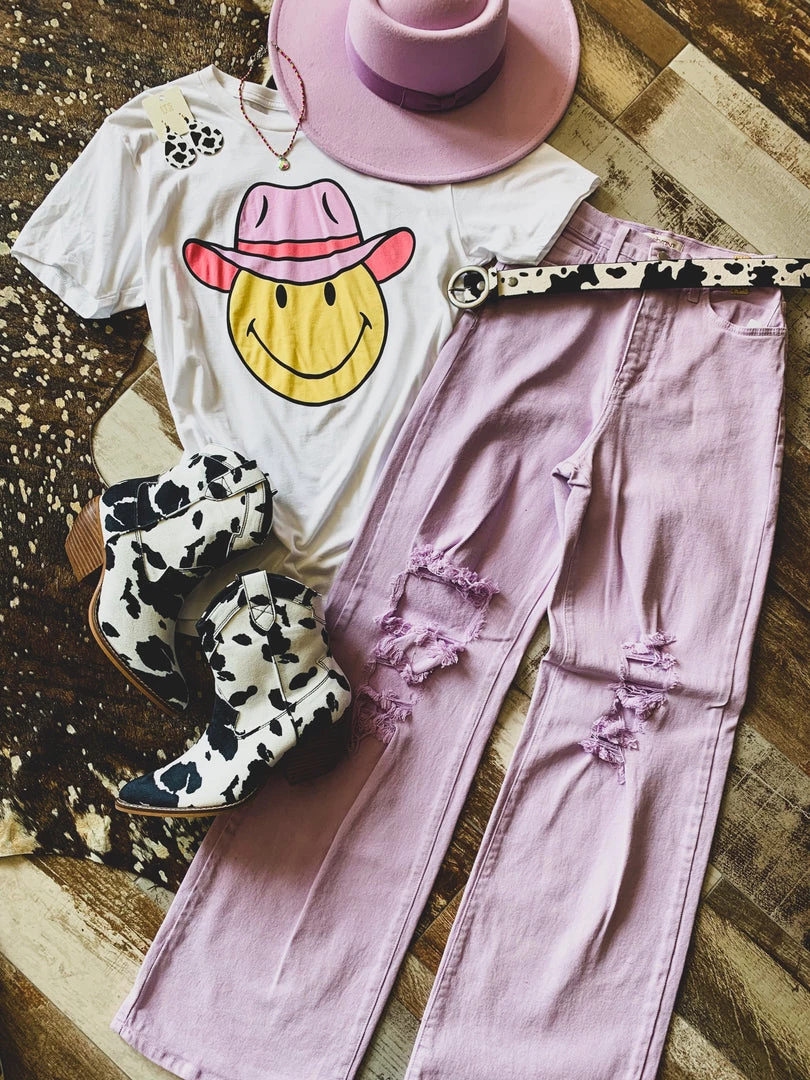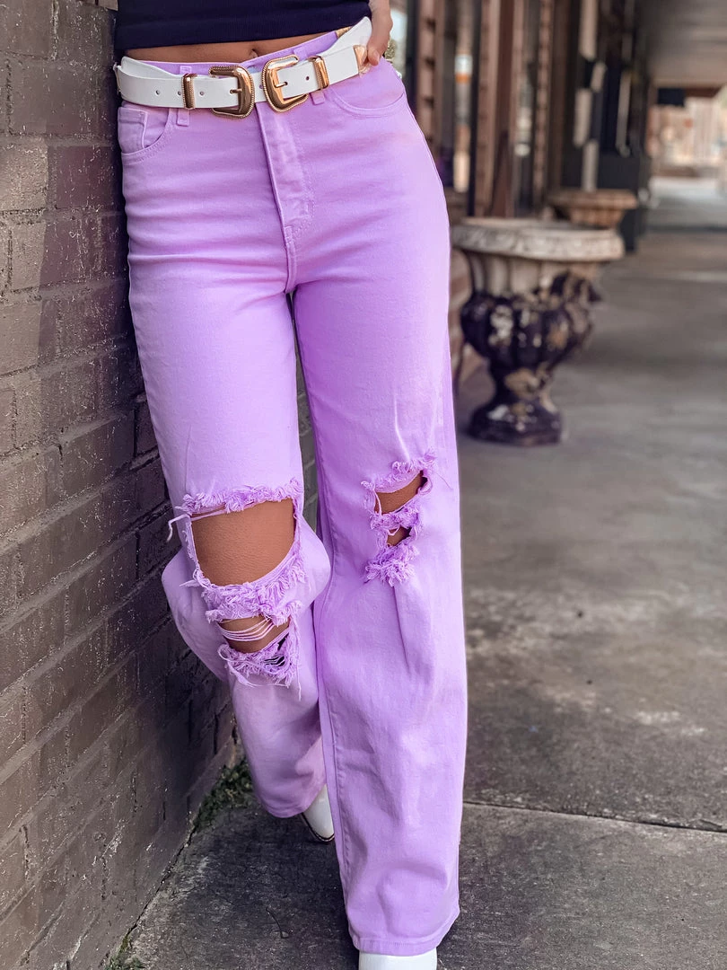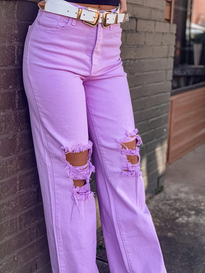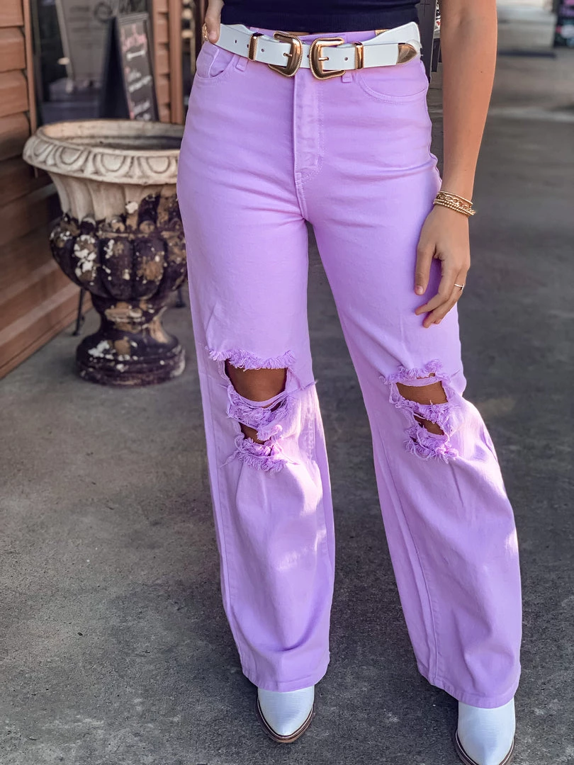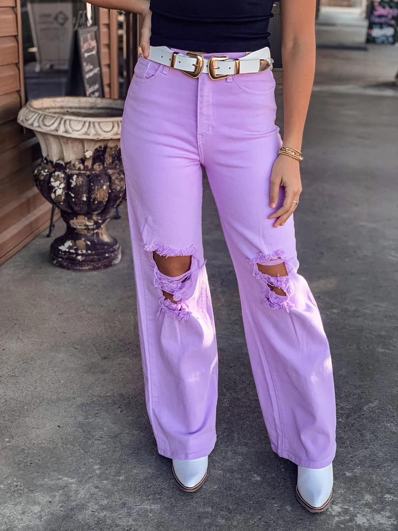 Gypsy Waltz staff FAVORITE! New LAVENDER colored denim flares got us OBSESSED. Features knee distressing, high-waisted, traditional front button and zipper closure, front pockets, back pockets, and a cute flared hemmed bottom. Jeans fit so flattering and have a good bit of stretch. SO 90’s denim retro and we LOVE it paired with our Aledo Pants, Sanger hat, Albany Belt, Converse Necklace, Ovilla Earrings, and Burton Booties for the complete look!