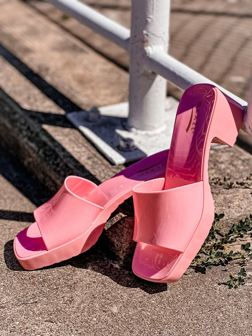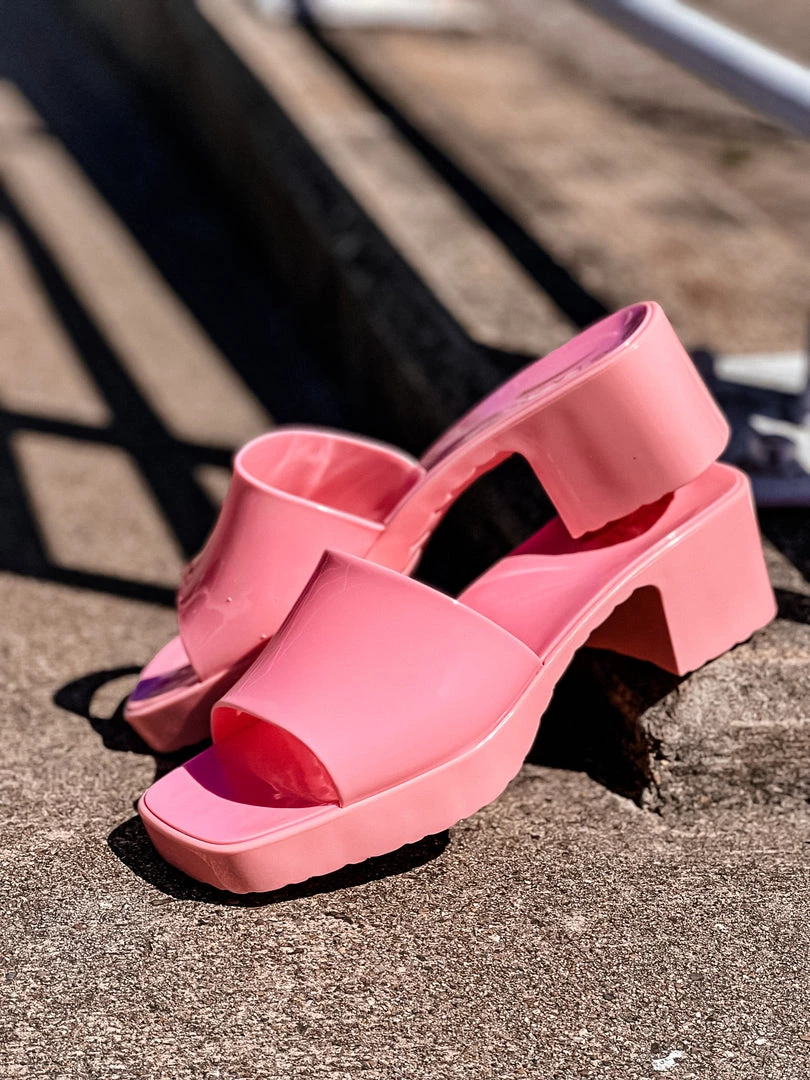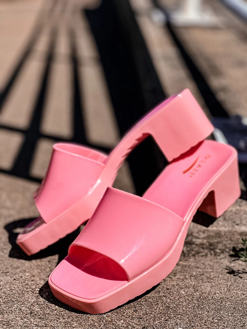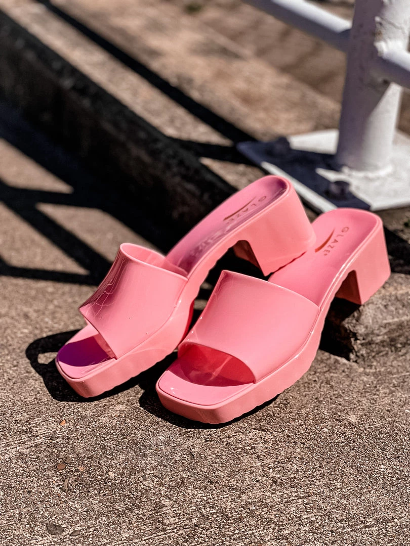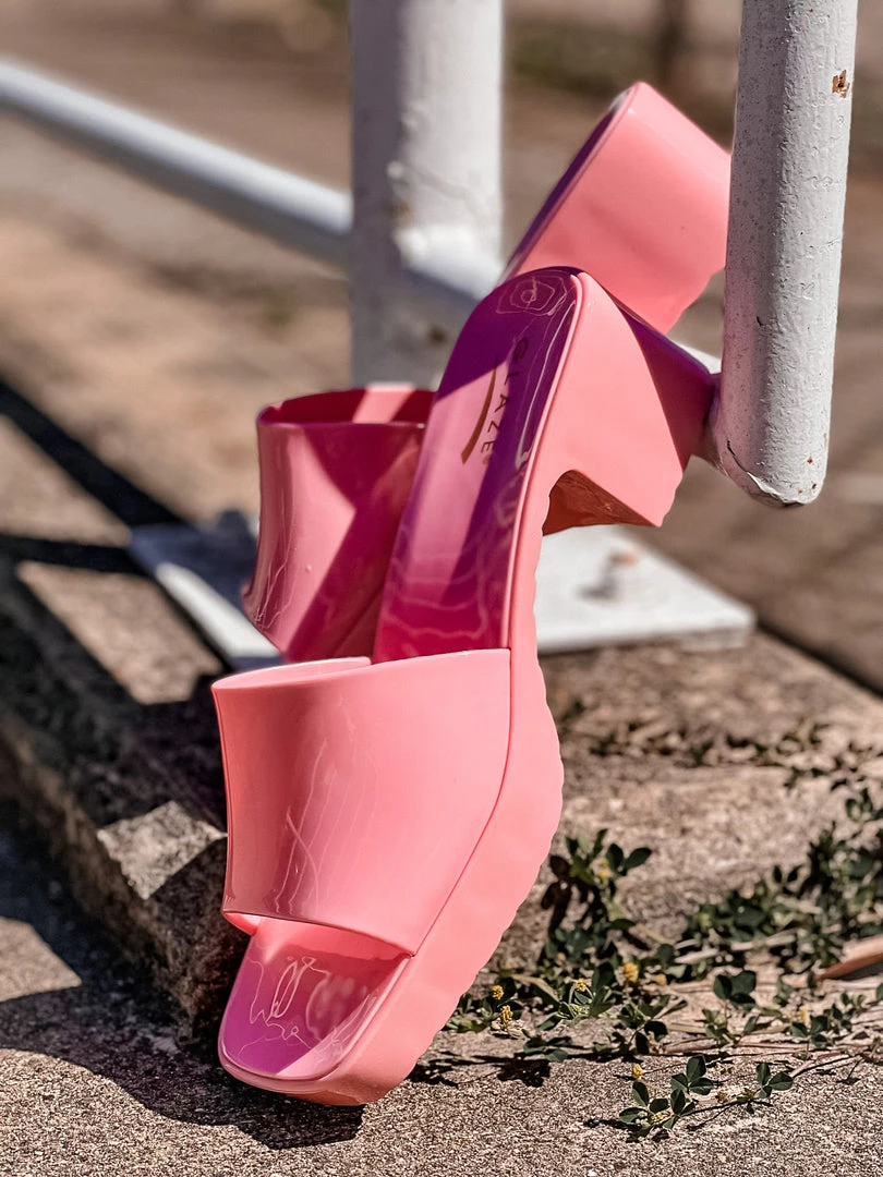 - Open toe slide on sandal, short chunky heels, small platform sandal, glossy finish