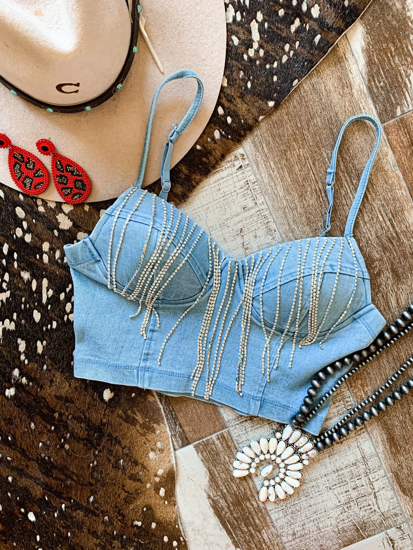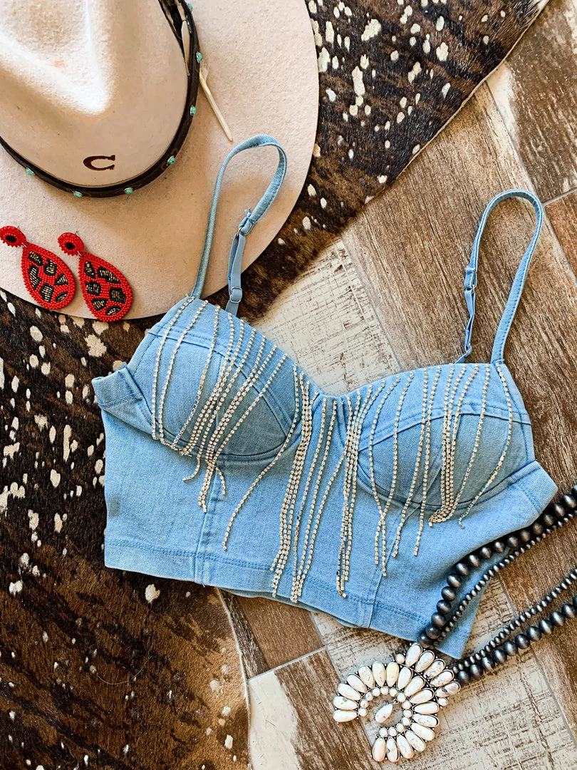 - Show stopping light wash denim bralette crop top with rhinestone fringe