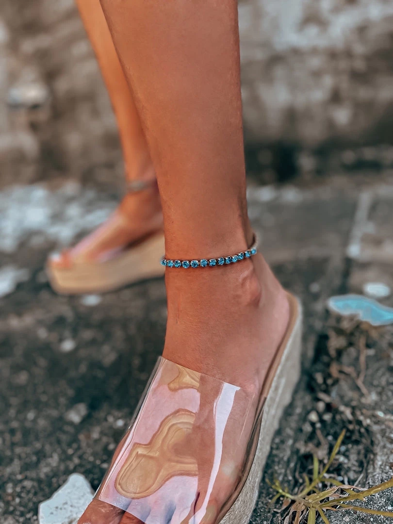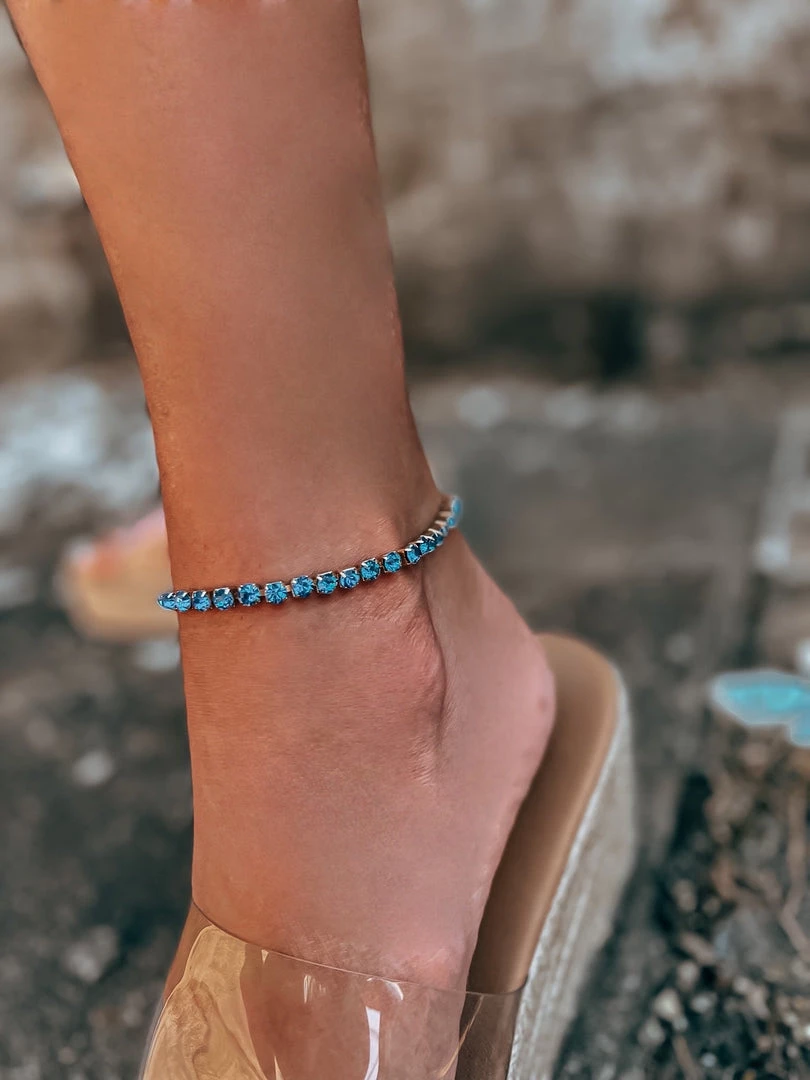 Sapphire colored rhinestone bracelet with a gold adjustable clasp. Bracelet is the perfect touch of color to add to your outfits! Even perfect to wear as an ankle bracelet.