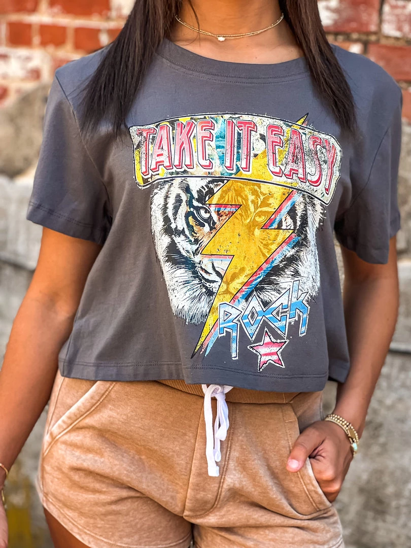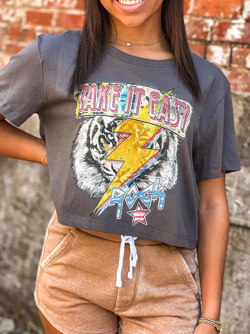 - Retro vintage “Take It Easy” “Rock” quote on a cropped gray graphic tee