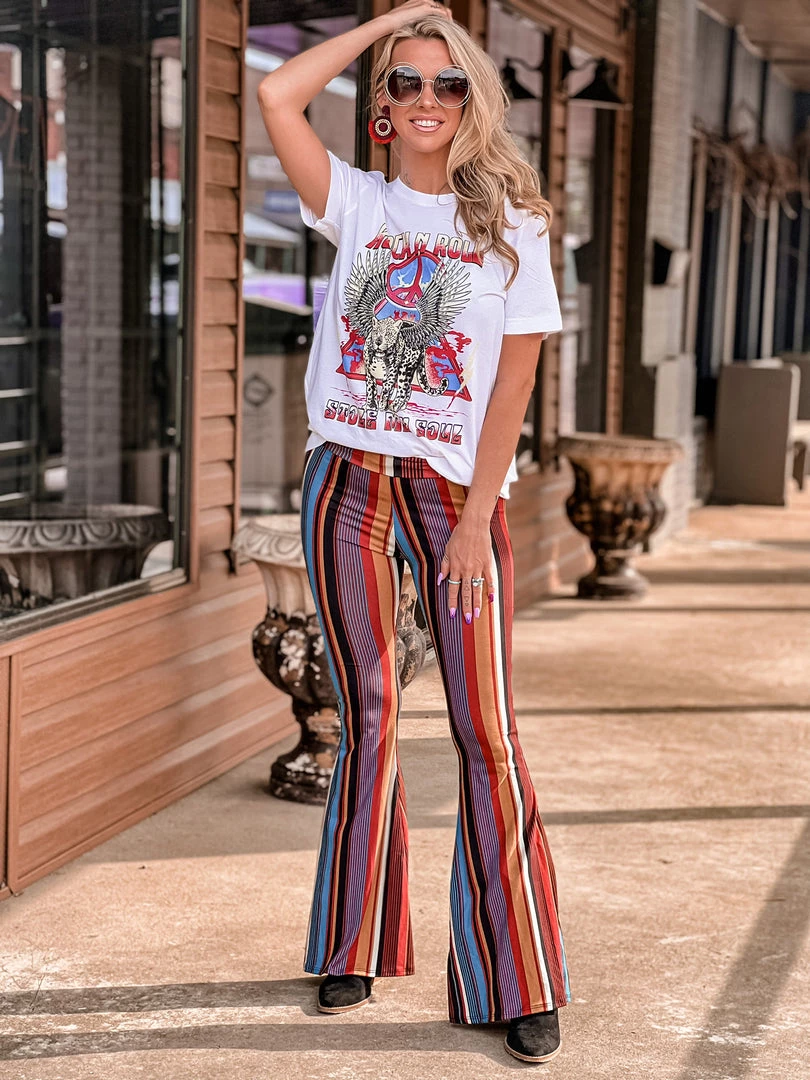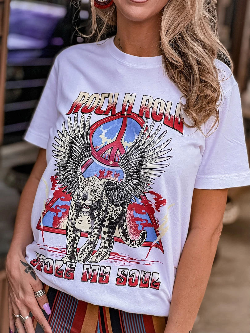 - Retro vintage “Rock N Roll Stole My Soul” on a white graphic tee