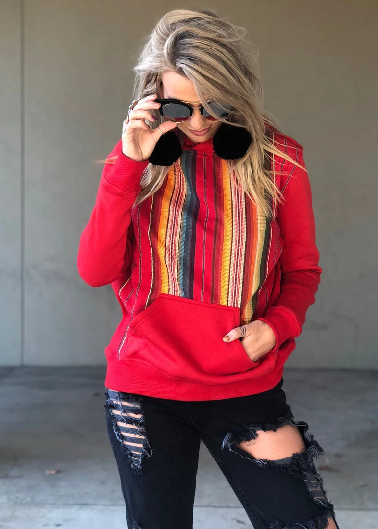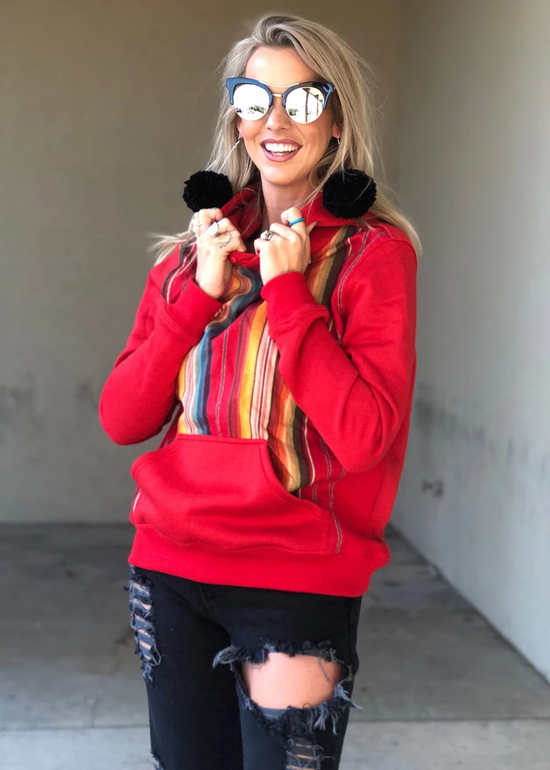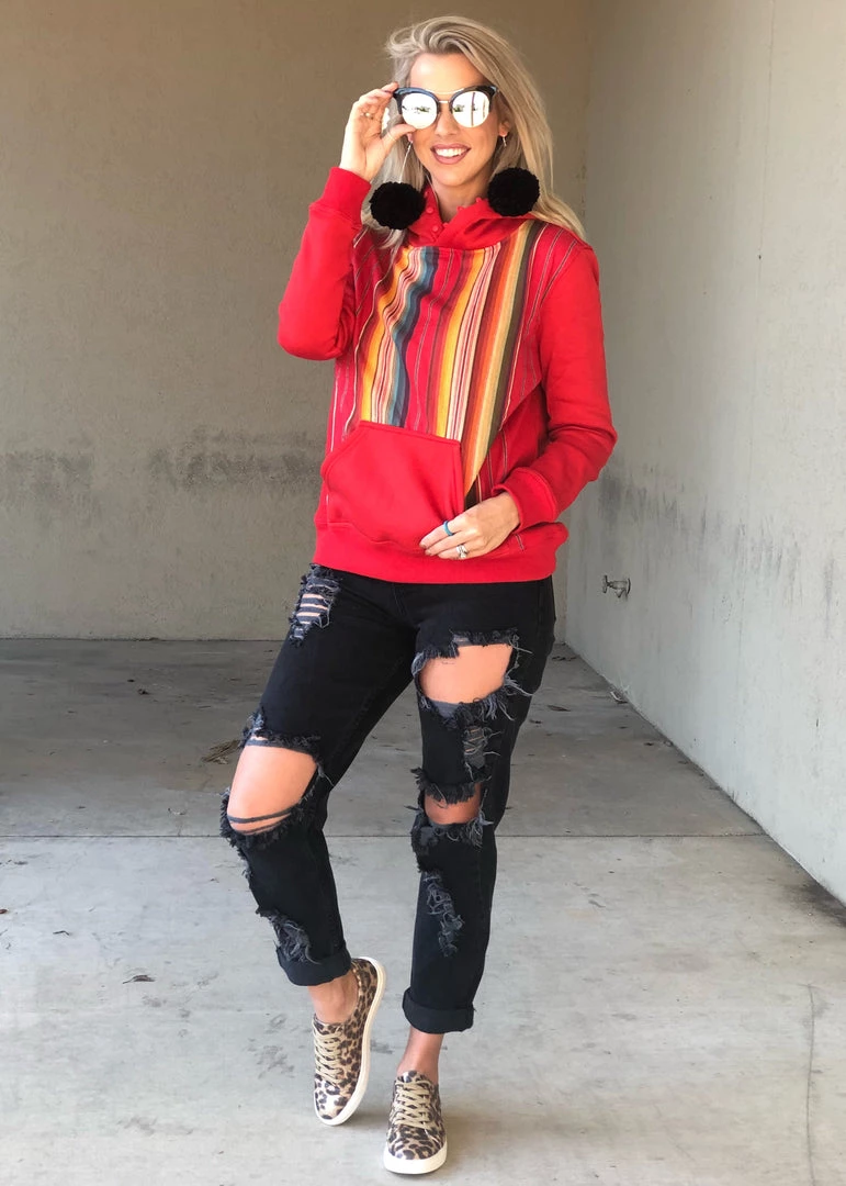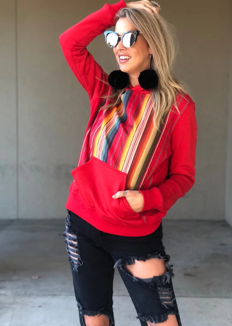 Serape front hoodie. Features 3 button detail at the neck and a front pouch pocket. Perfect with distressed jeans and sneakers for a day full of errands!Â