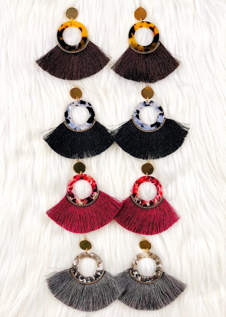 Tortoise hoop shape with fan tassel detail from the bottom of the hoop with a thin bling strip. Such a statement maker! Stud earring.