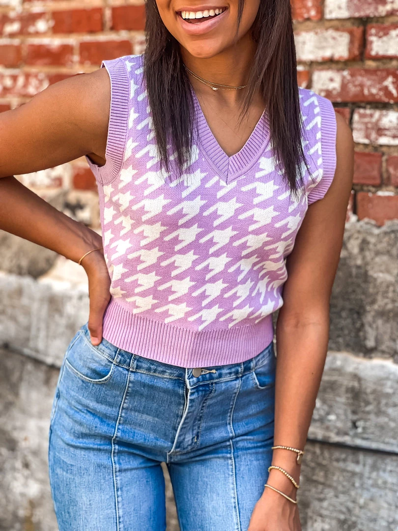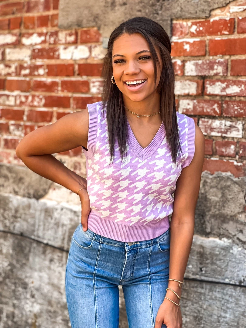 - Purple houndstooth pattern front, contrast rib-knit hems