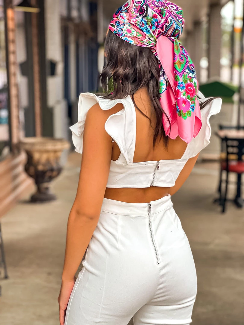 - Classy chic must have white denim ruffle jumpsuit