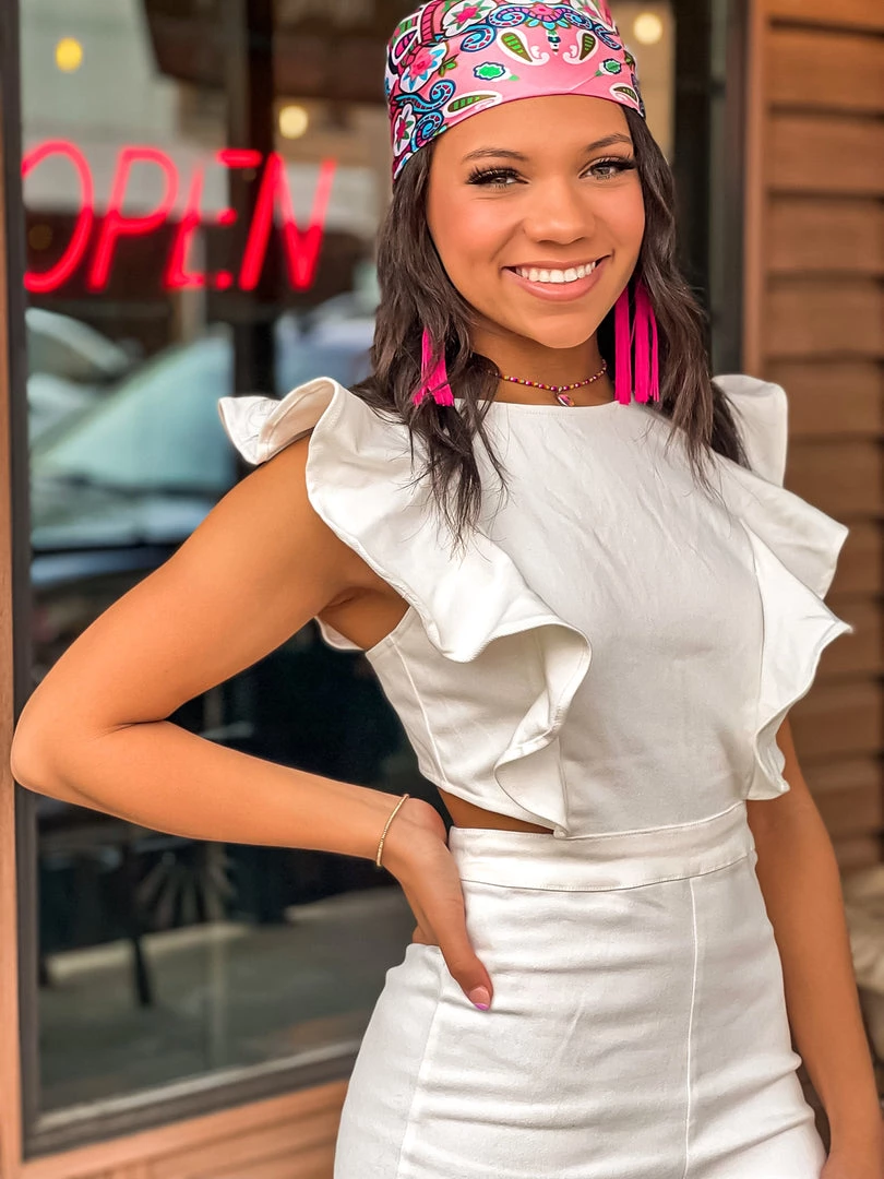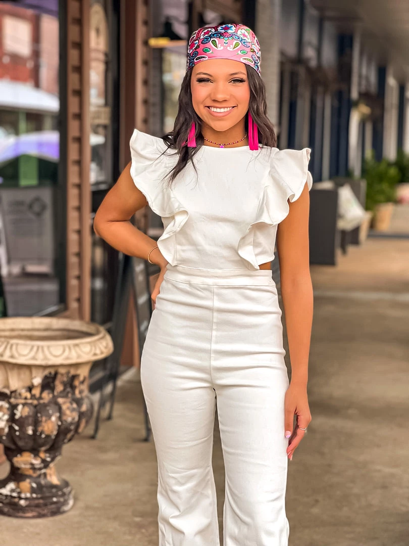- White denim jumpsuit, ruffle short sleeves, flare pant, side cut outs with an open back, zipper back closure