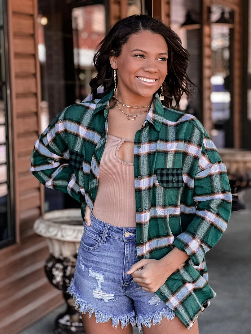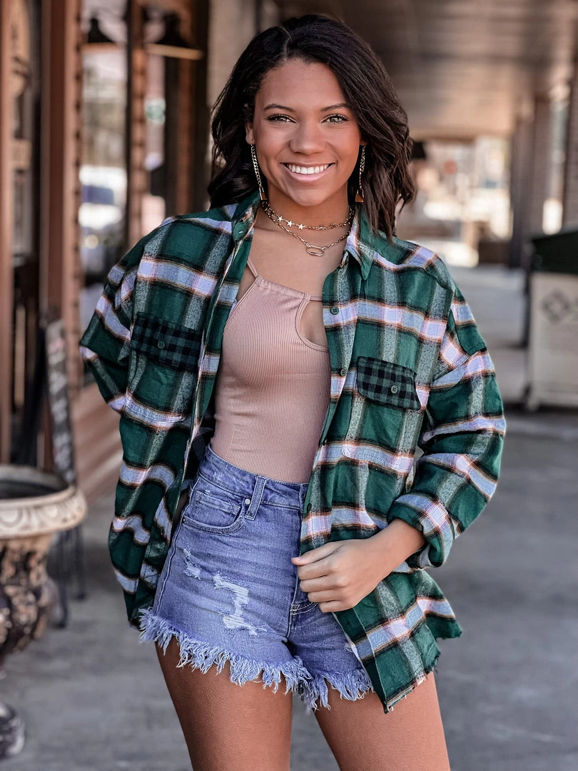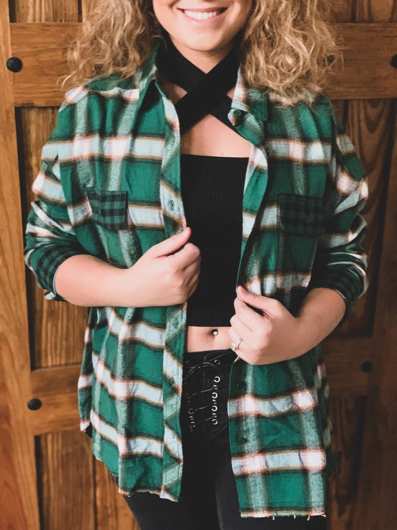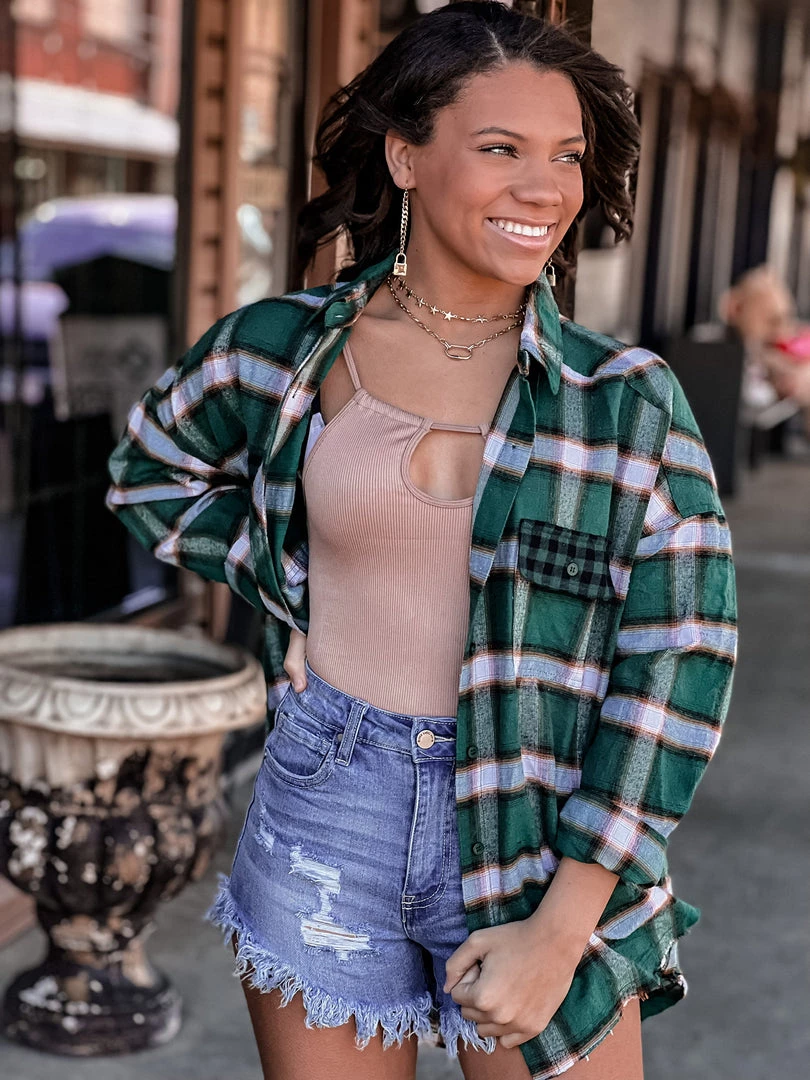 Our new beautiful green plaid flannel shacket is the perfect finishing layer to pair over all your favorite Fall crop tops, bodysuits, and Christmas tees. Features a lightweight green plaid flannel pattern, collar, button wrist cuffs and button front closure, two front buffalo plaid chest pockets, and raw cut frayed hemline. This one will be a forever favorite!