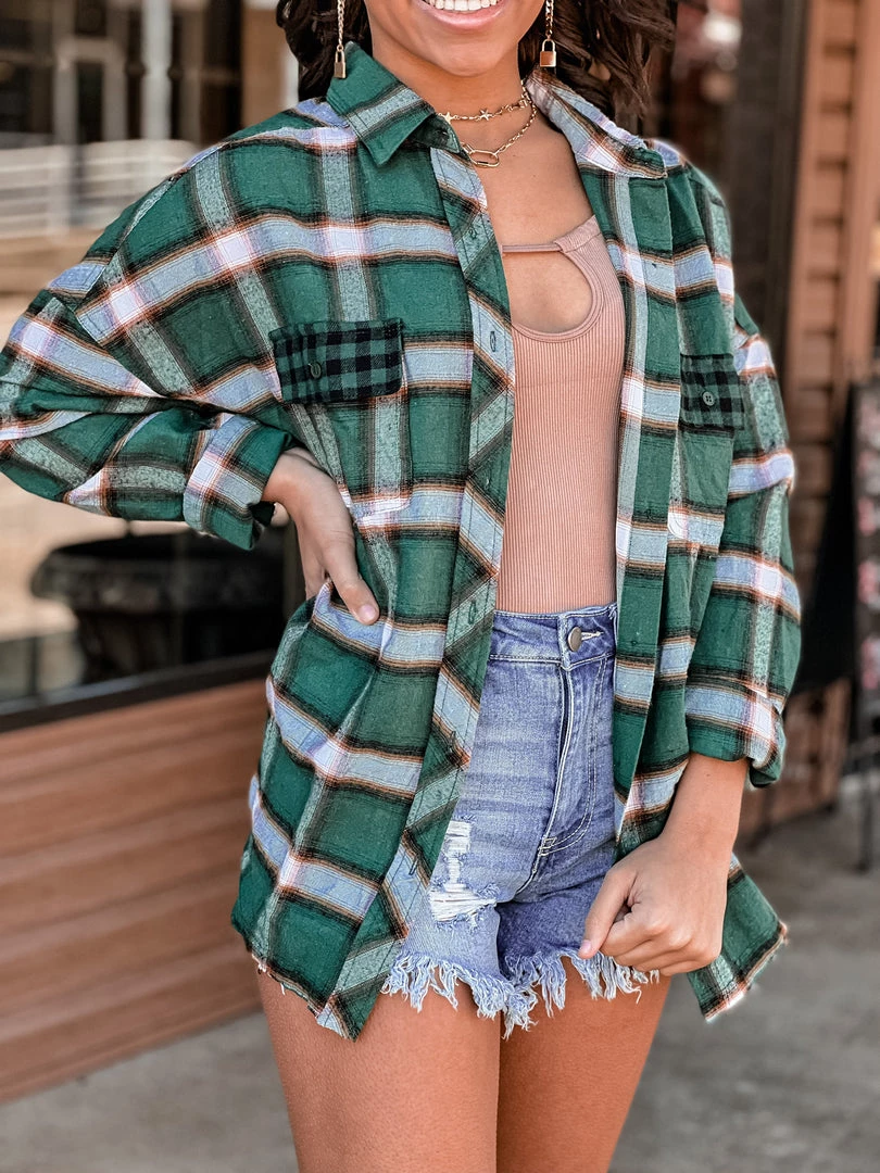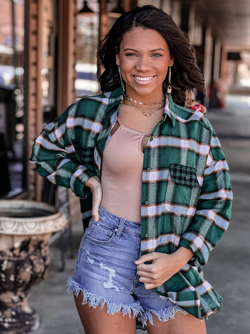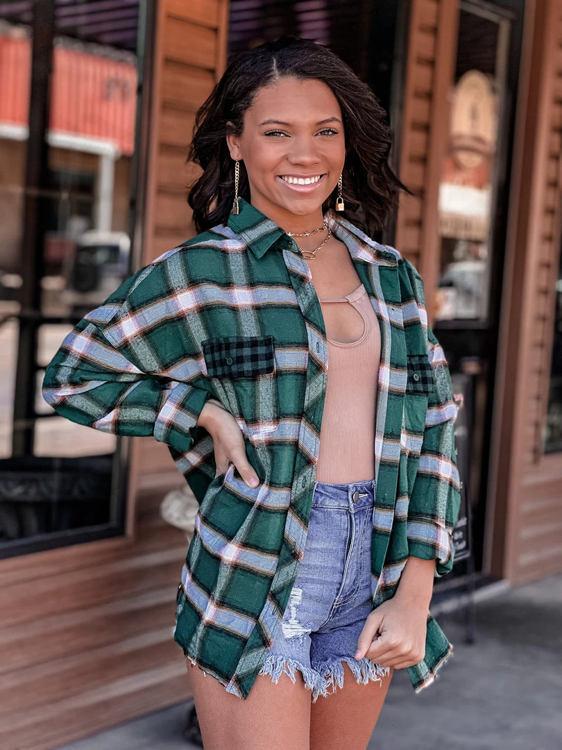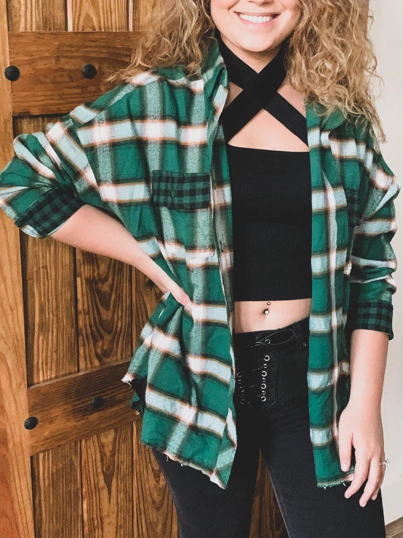 Our new beautiful green plaid flannel shacket is the perfect finishing layer to pair over all your favorite Fall crop tops, bodysuits, and Christmas tees. Features a lightweight green plaid flannel pattern, collar, button wrist cuffs and button front closure, two front buffalo plaid chest pockets, and raw cut frayed hemline. This one will be a forever favorite!