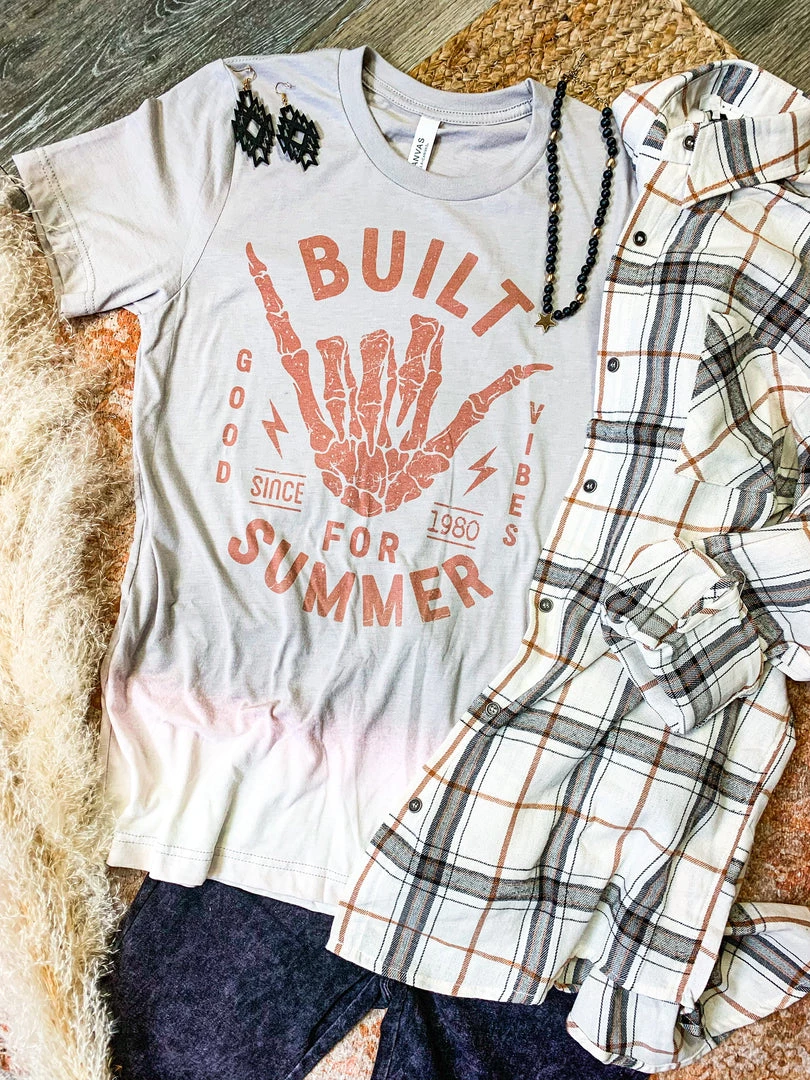 - Rust distressed graphic, “Built For Summer” “Good Vibes” “Since 1980”, rock n roll skeleton hand, lightning bolt