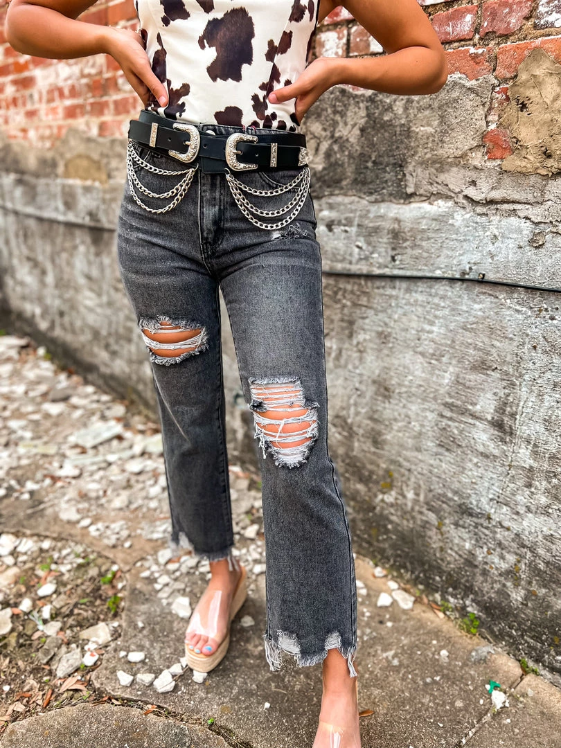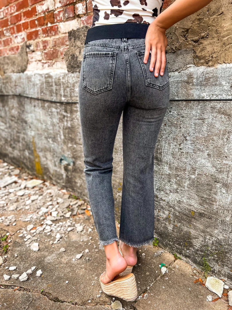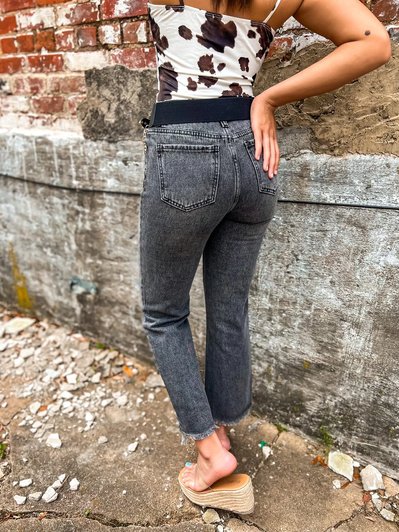 - Vintage gray washed denim, straight leg fit, distressing on thigh and knee, distressed raw frayed hem, high rise waist, traditional front and back pockets with button zipper closure