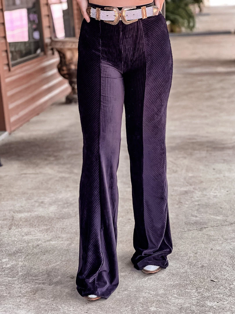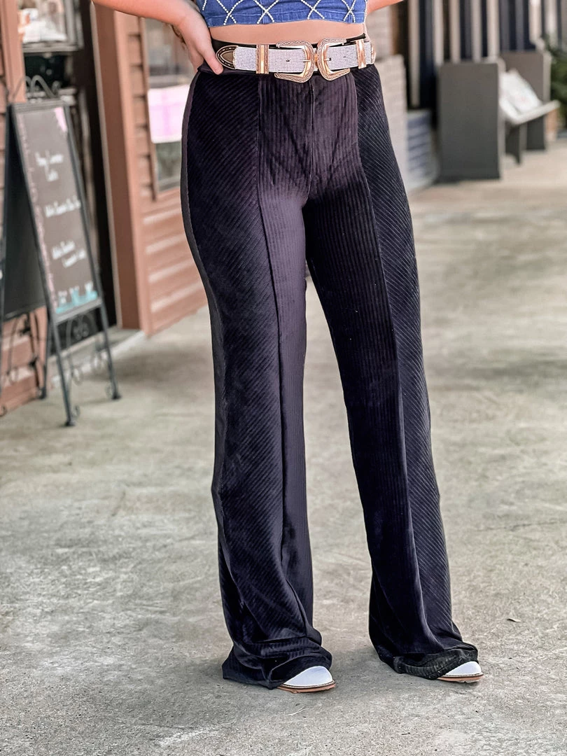 - Black velvety ribbed pattern, high rise waistband, pintuck details, hidden zipper back closure, dress pant style