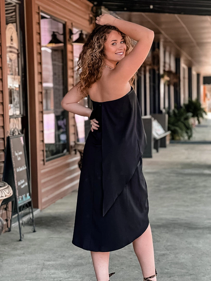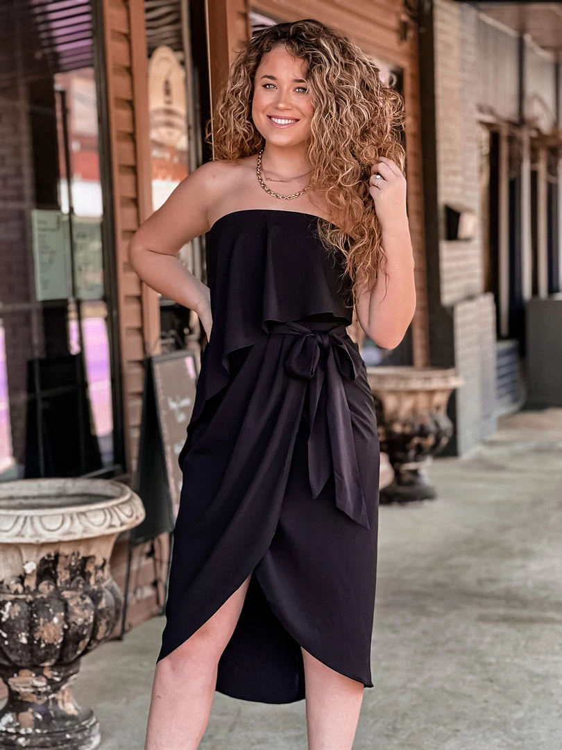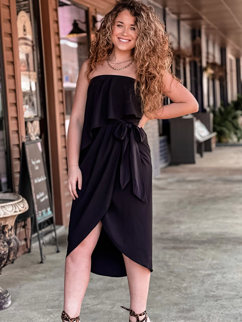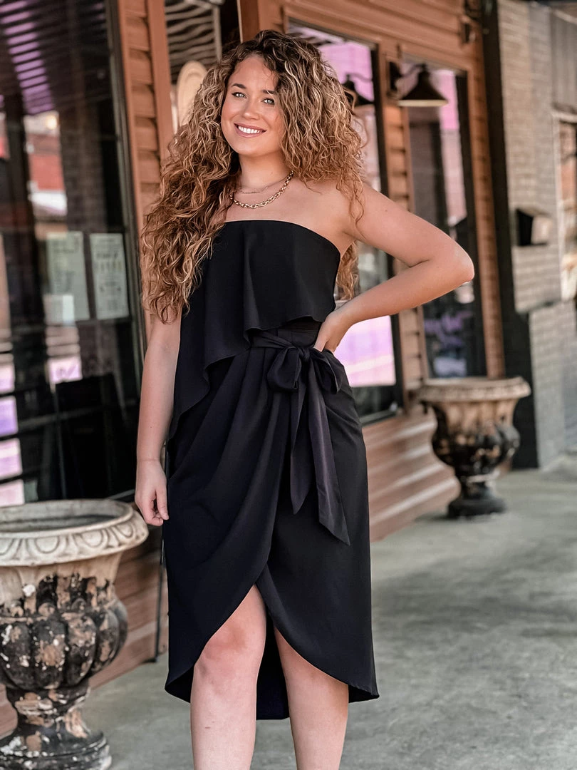 - Strapless style, has an asymmetrical top ruffle, skirt inner-lining, front wrap tulip style with self tie, hidden back zipper closure
