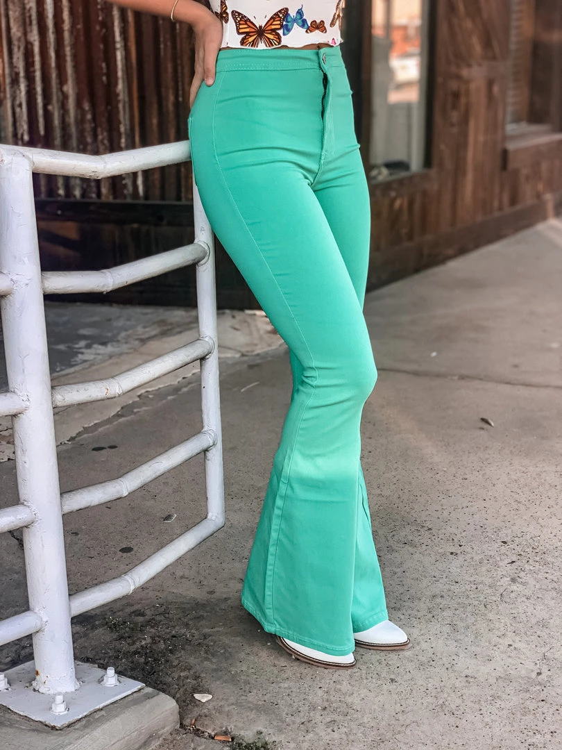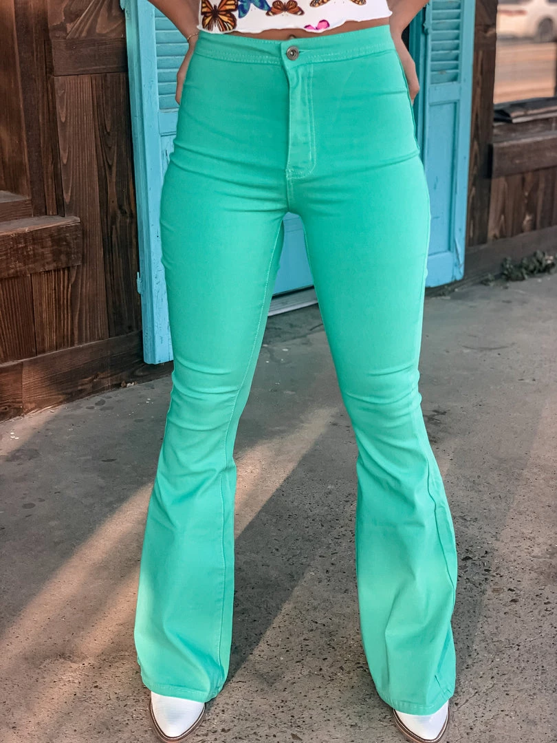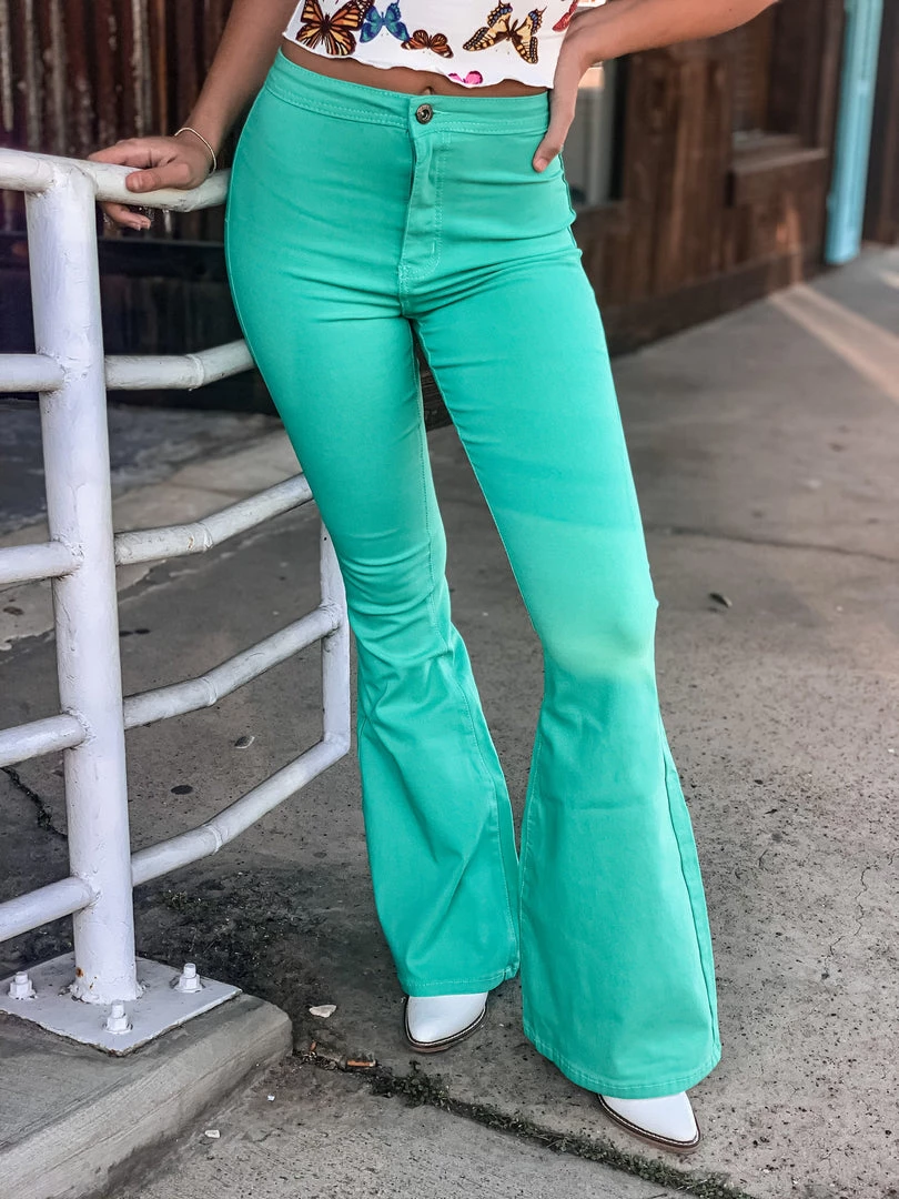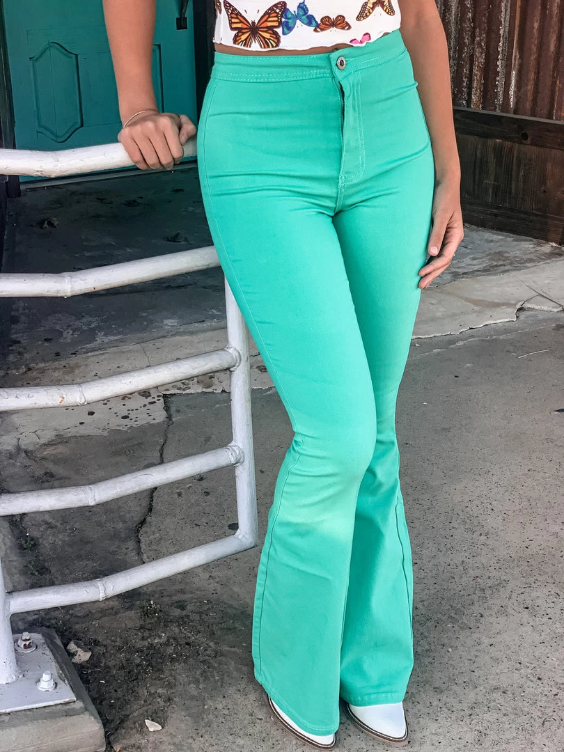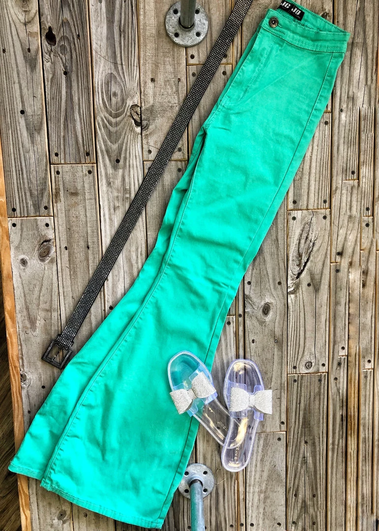 Mint turquoise bell bottoms are the perfect statement piece. Bells feature two back pockets, front button and zipper, and a smooth waistband. Bells are stretchy and very comfortable. Pair with all the cutest graphic tees for the perfect look!