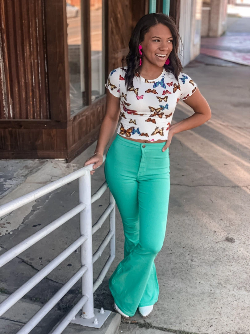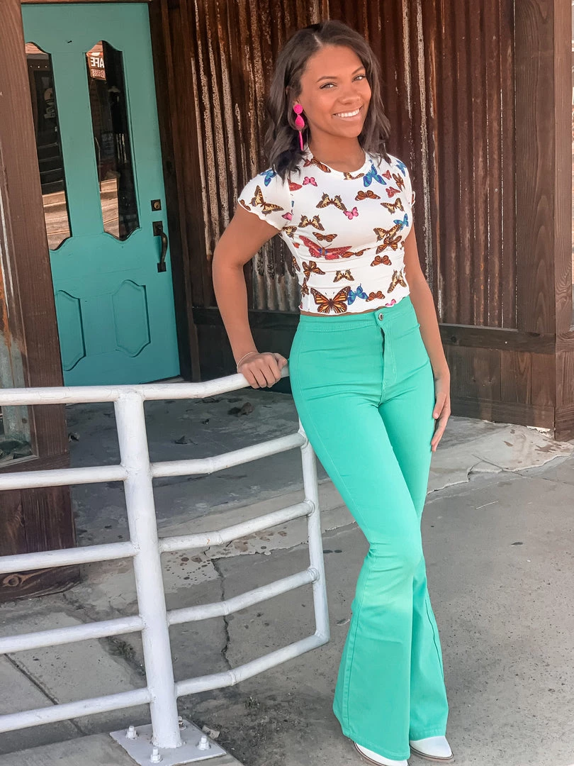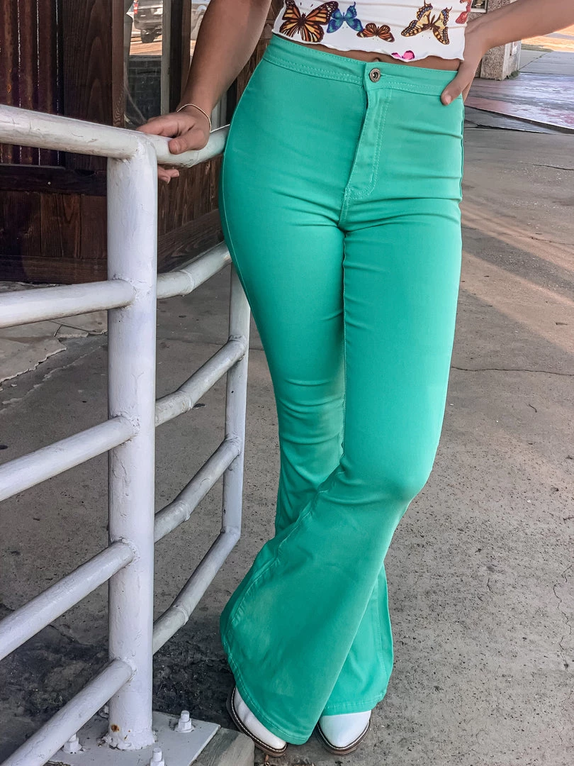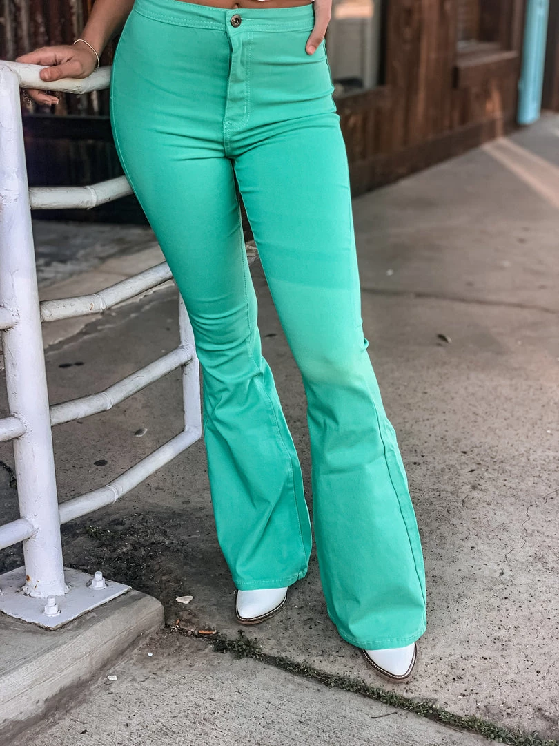 Mint turquoise bell bottoms are the perfect statement piece. Bells feature two back pockets, front button and zipper, and a smooth waistband. Bells are stretchy and very comfortable. Pair with all the cutest graphic tees for the perfect look!