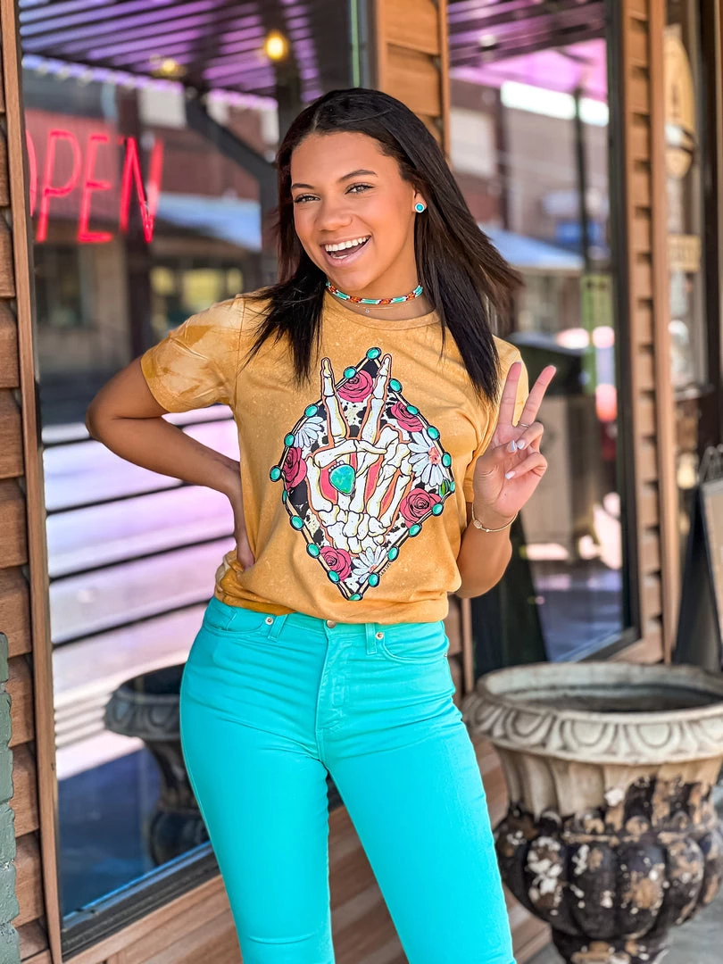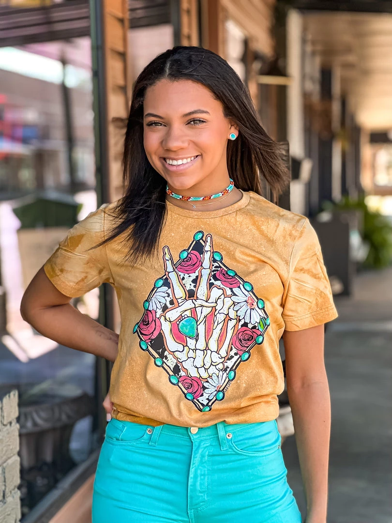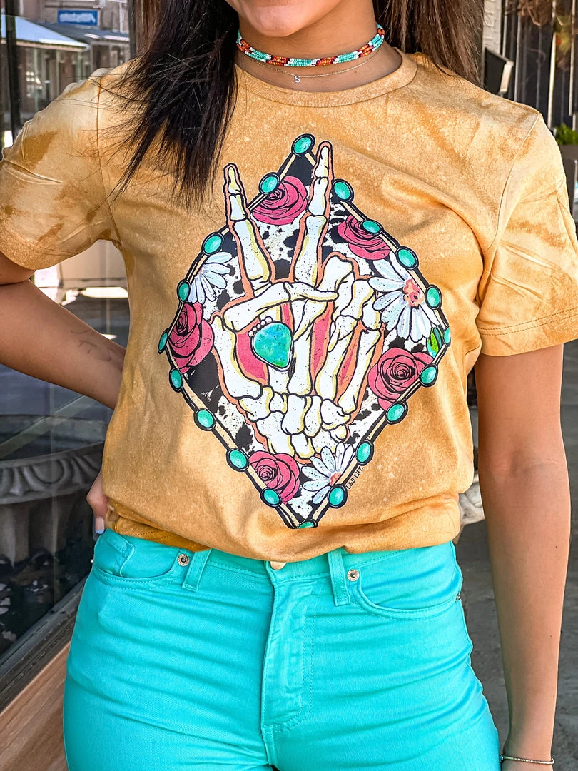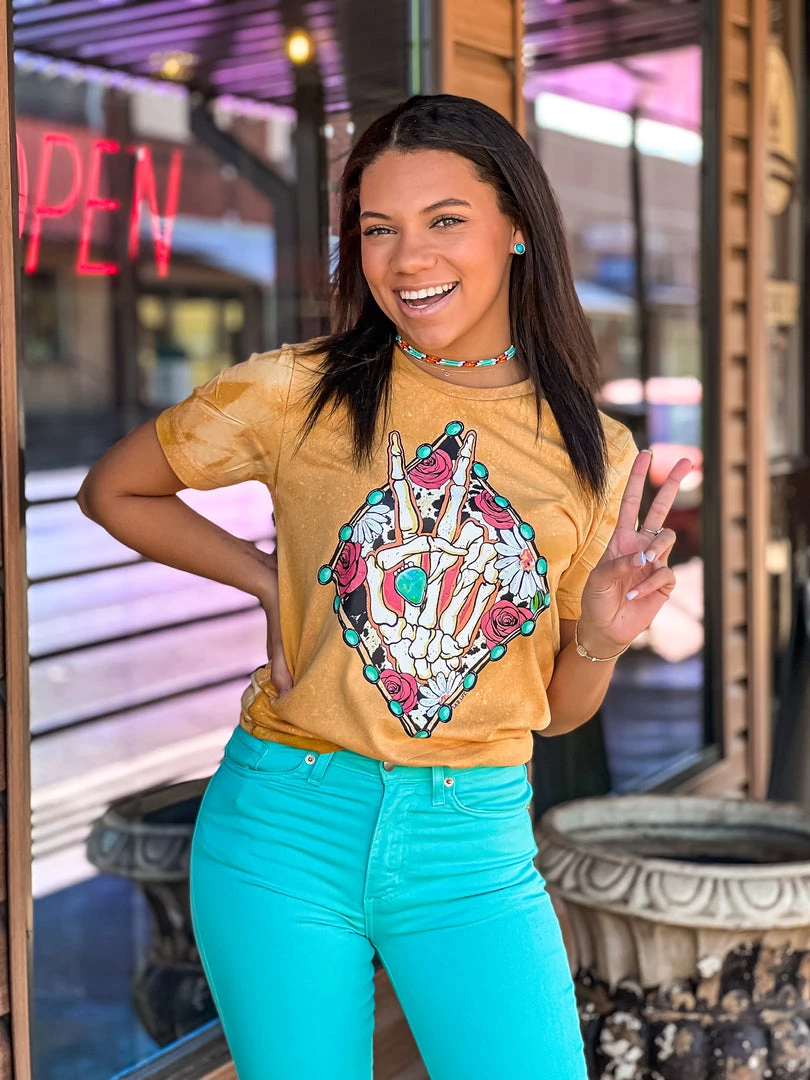 - Bleached mustard graphic tee, diamond shaped turquoise concho, cow print, floral, skeleton peace sign