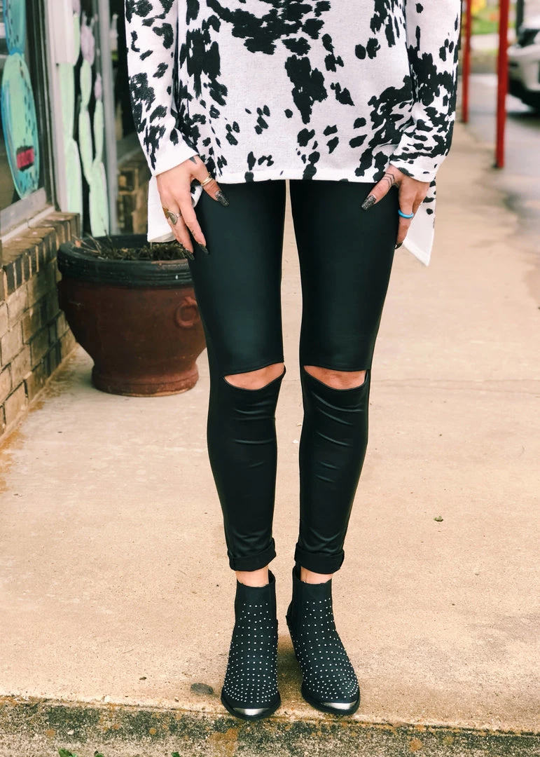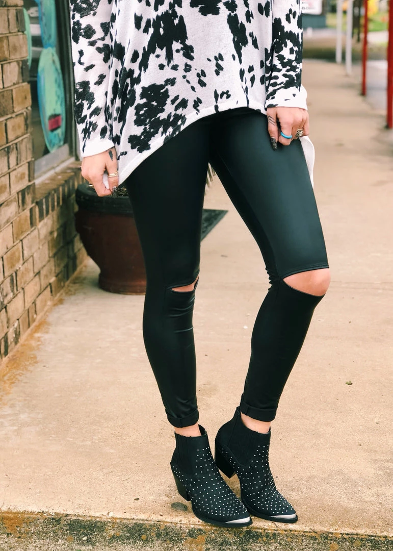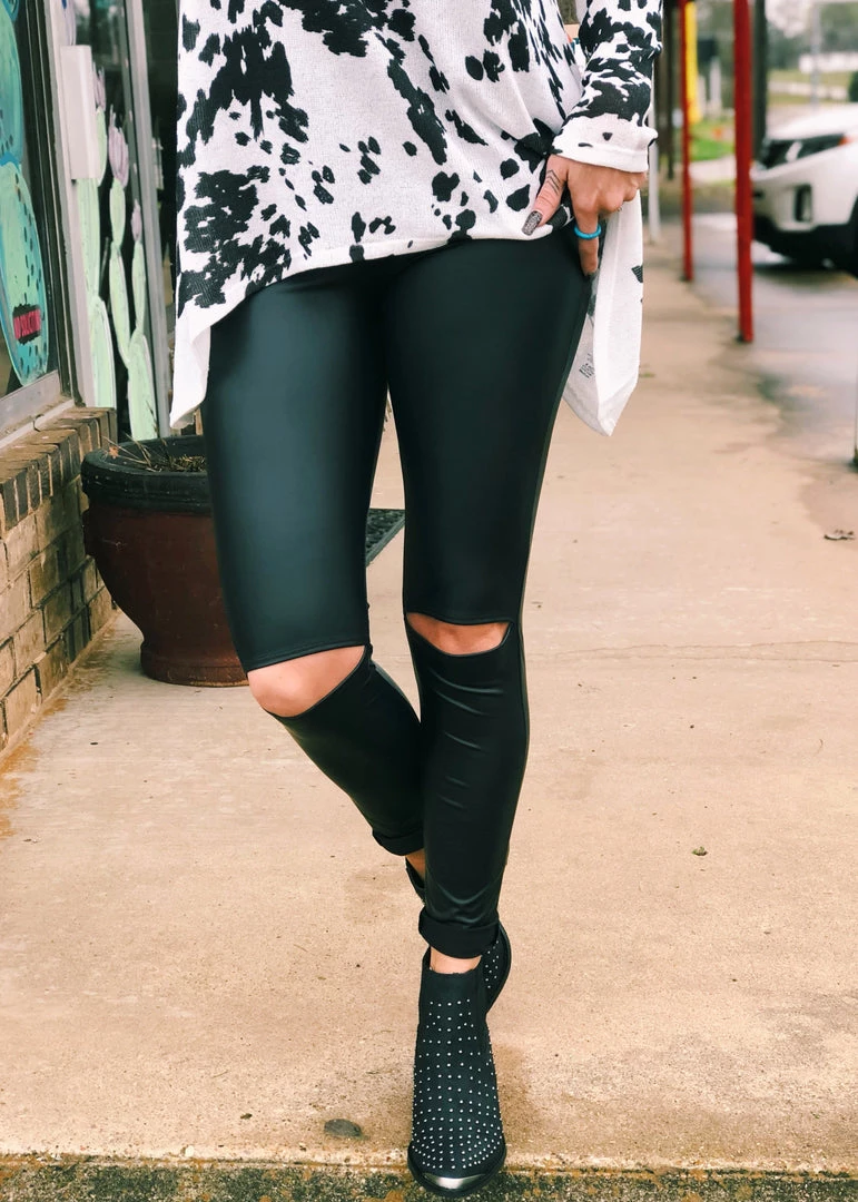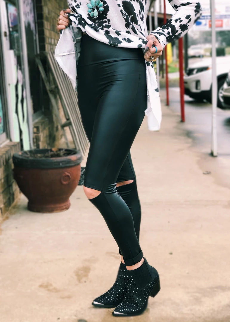 High waisted leather leggings. Features slashed knee detailing. Perfect with a cute top or graphic tee! So easy to dress up or down.Â