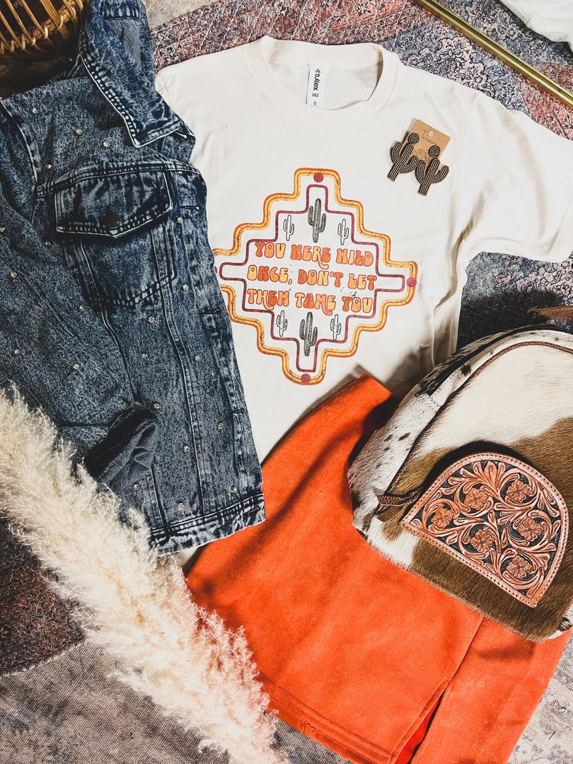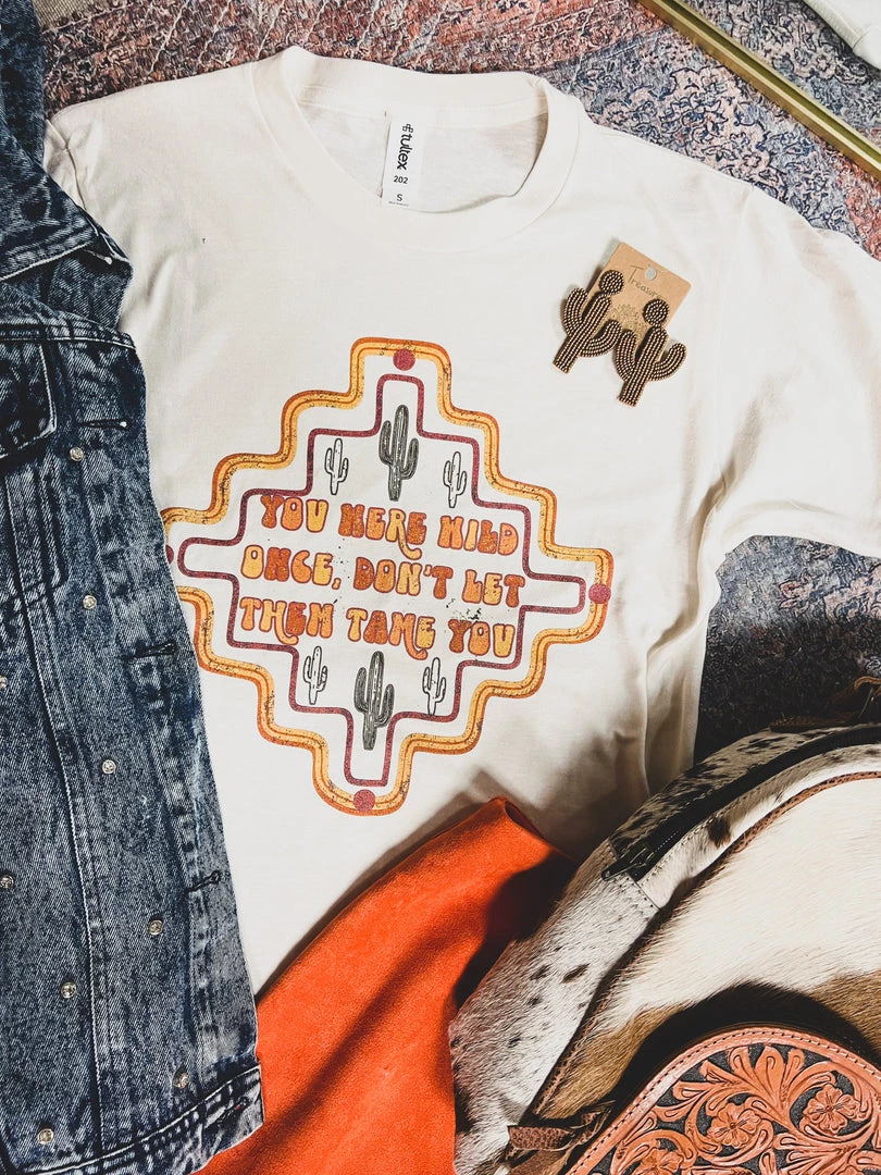 - Off white cream colored retro western “You were wild once, don’t let them tame you” graphic tee