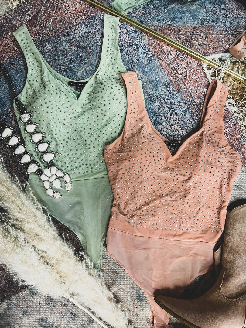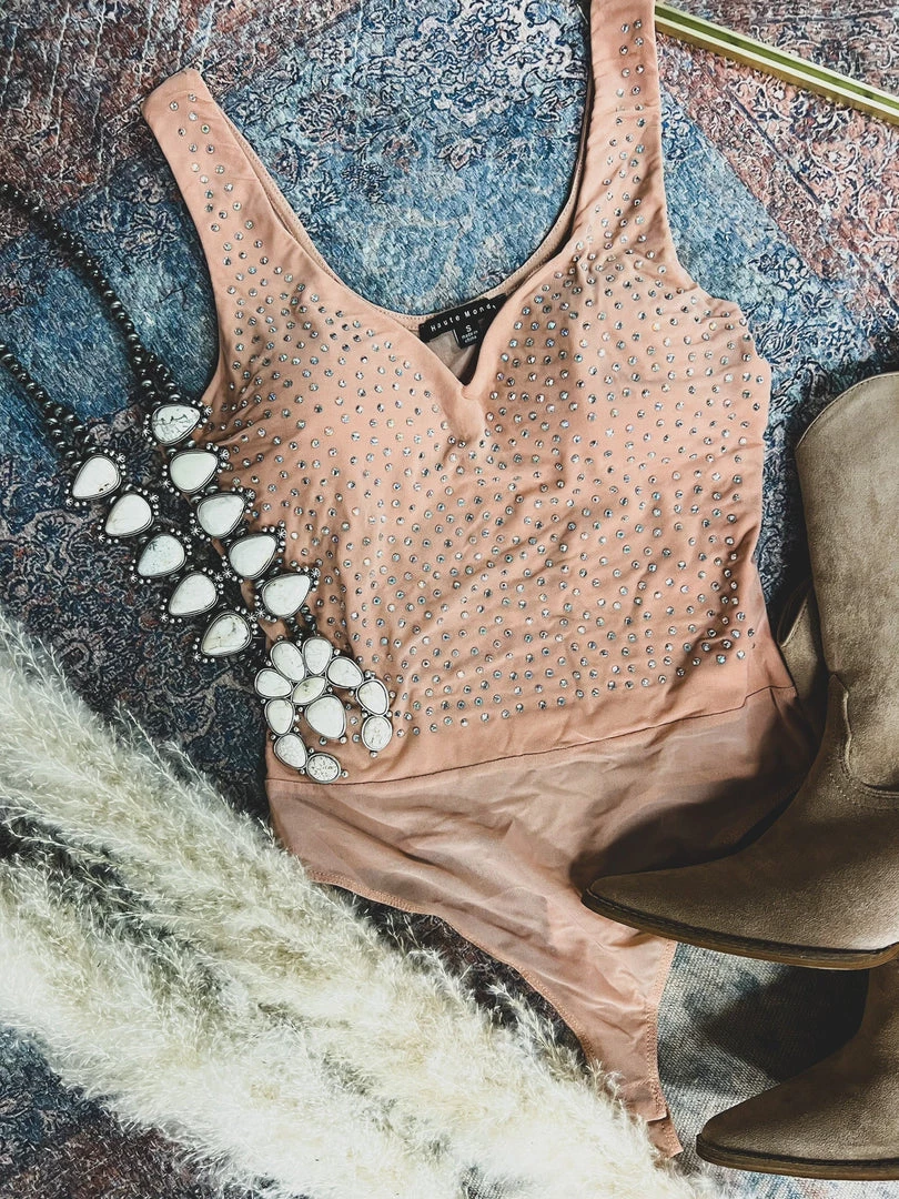 - Nude iridescent rhinestoned bodysuit, sleeveless, deep V-neckline, padded, front is double lined with the the back cheer mesh