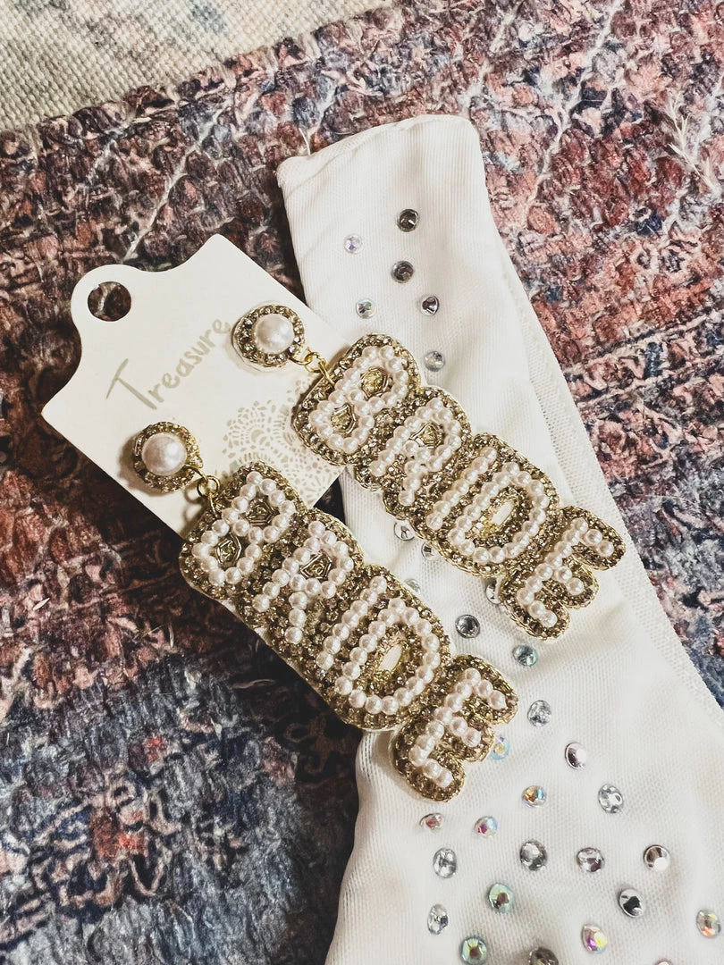 - Stunning rhinestone beaded “BRIDE” earrings
