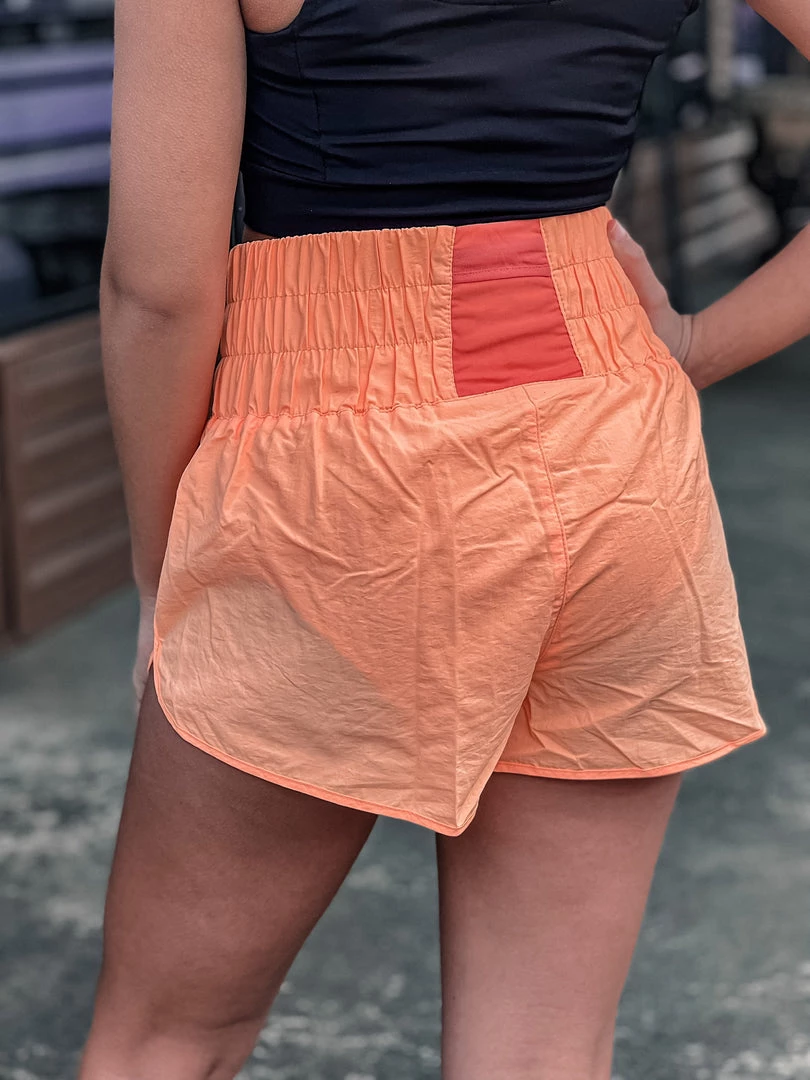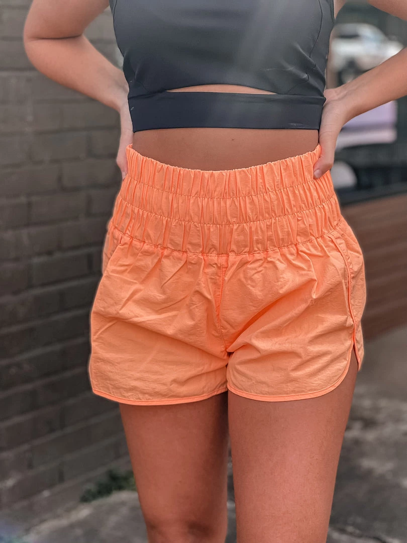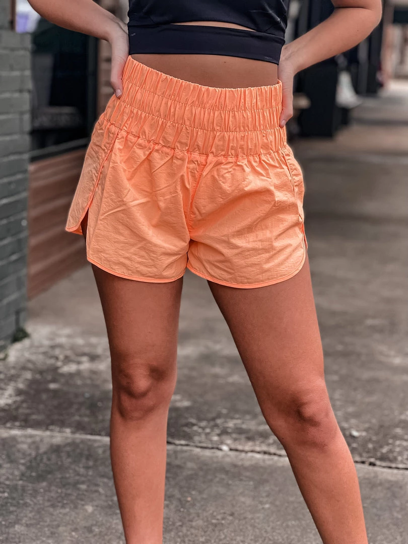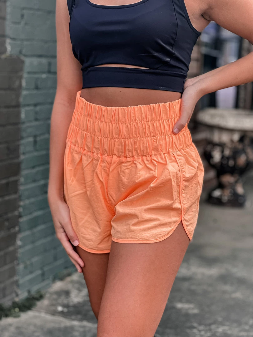 - Cute neon orange windbreaker smocked waistband running style shorts