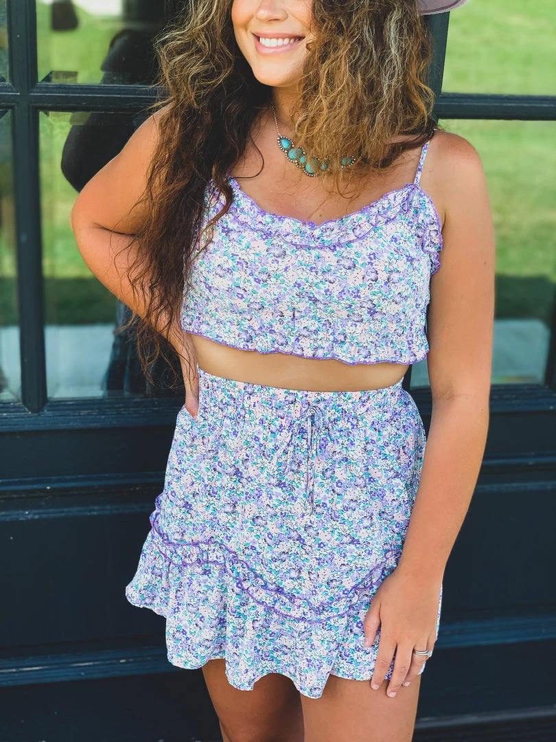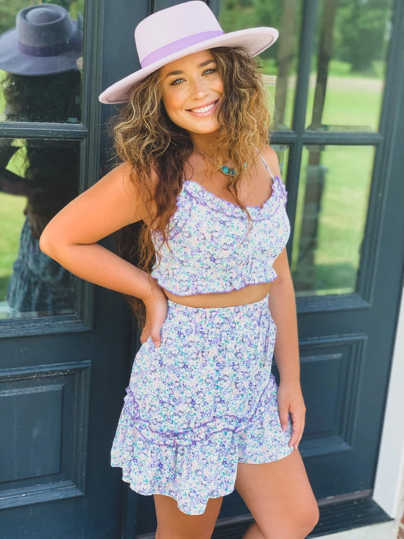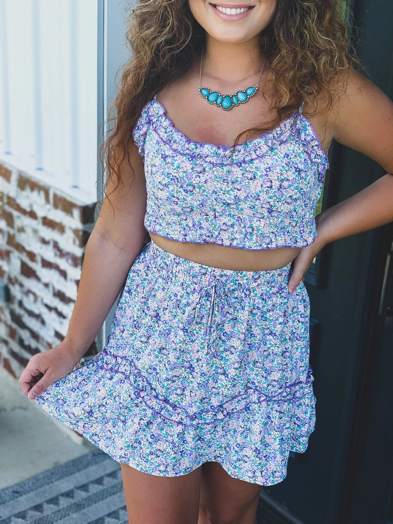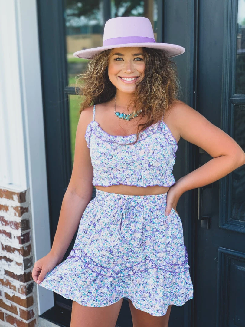 Beautiful lavender floral two piece set will have you obsessed. Set features a lavender floral crop top and a lavender floral skirt. Top features a cropped length, lettuce trim detail, adjustable spaghetti straps, and a super stretchy elastic band made for comfort. Skirt features an elastic stretchy waistband, a faux drawstring, a lettuce trim detail, and a light weight material. Perfect set for brunch or having lunch with the girls. Easily pair the crop top with your favorite pair of denim shorts or bell bottoms! The skirt also looks perfect with your favorite graphic tees!