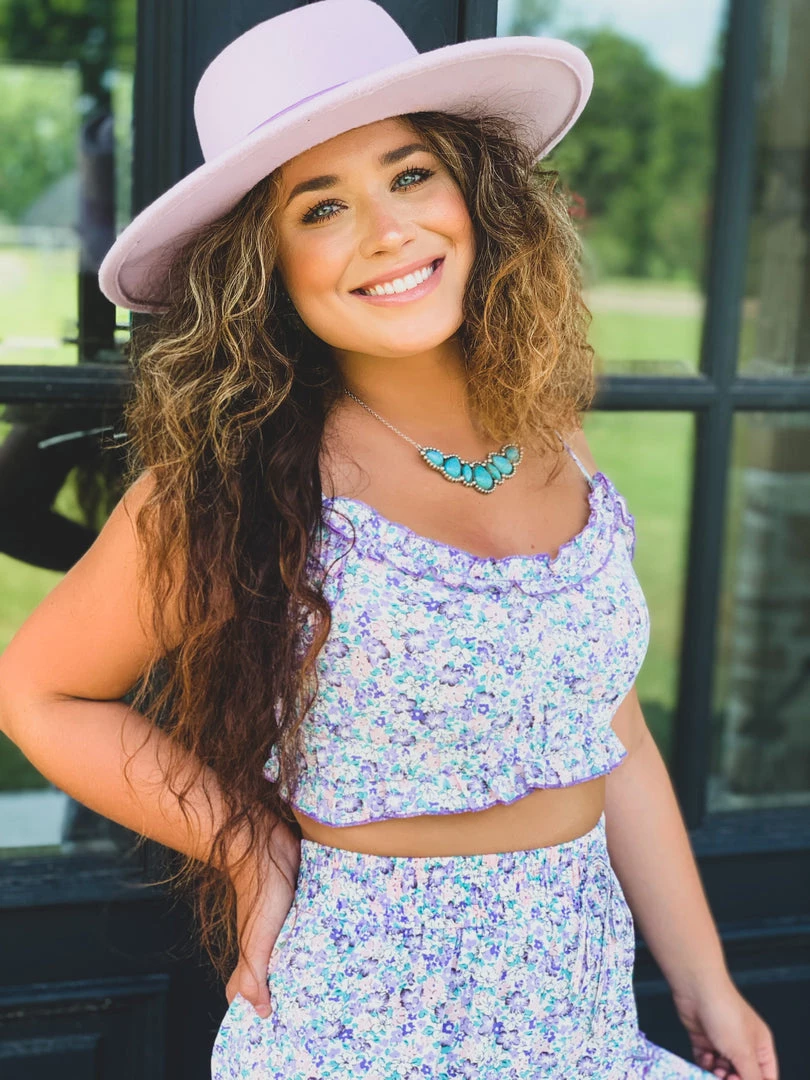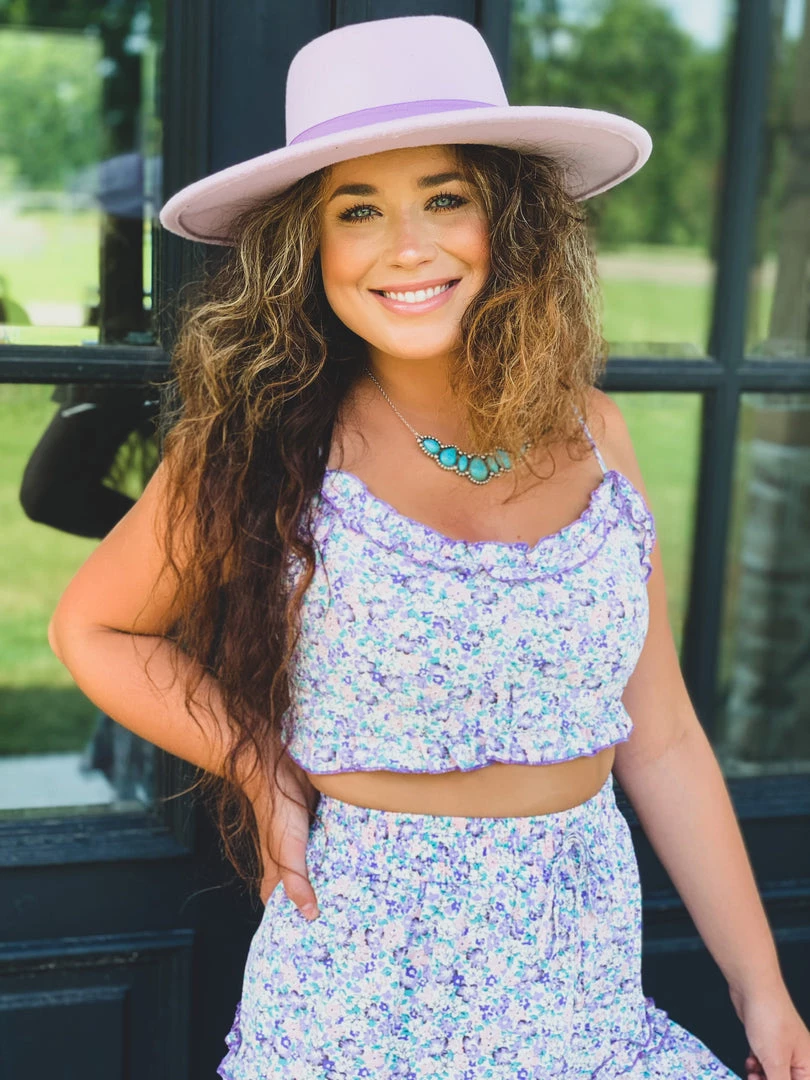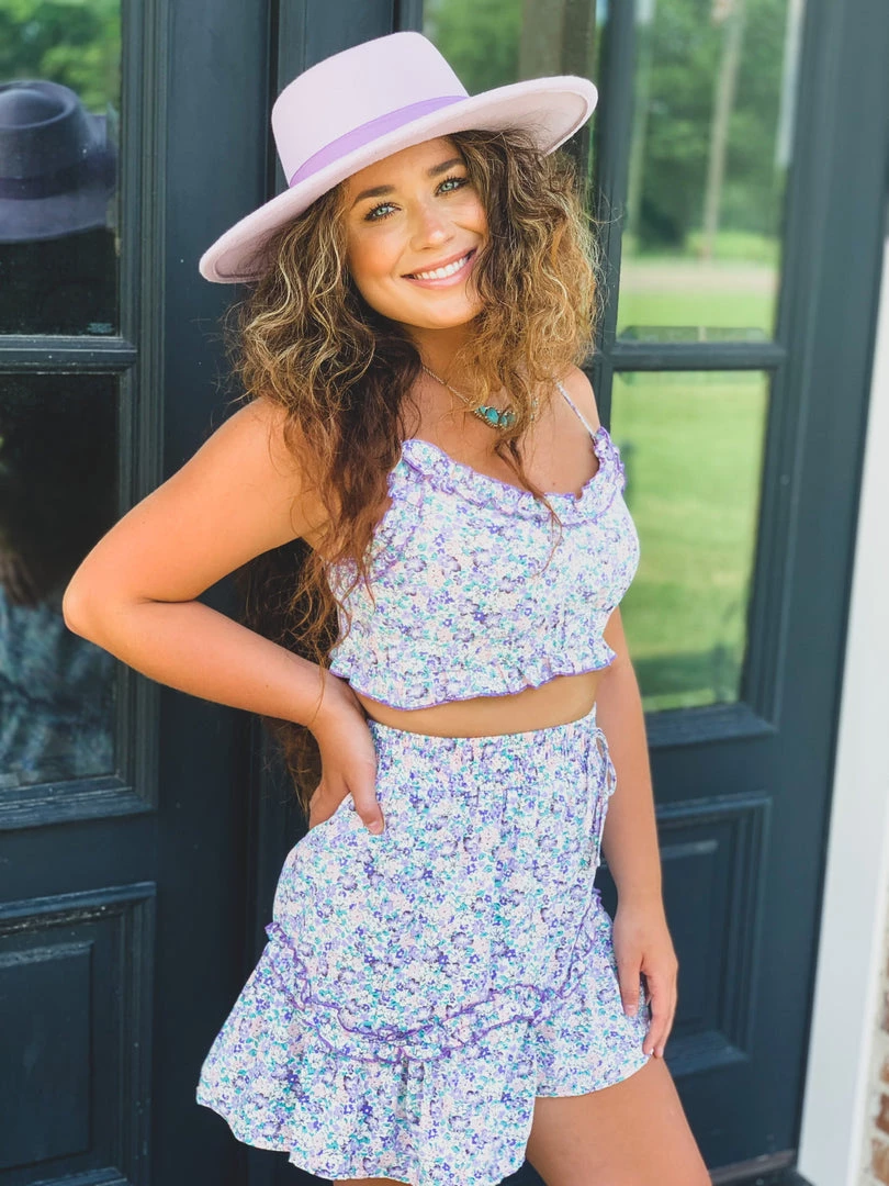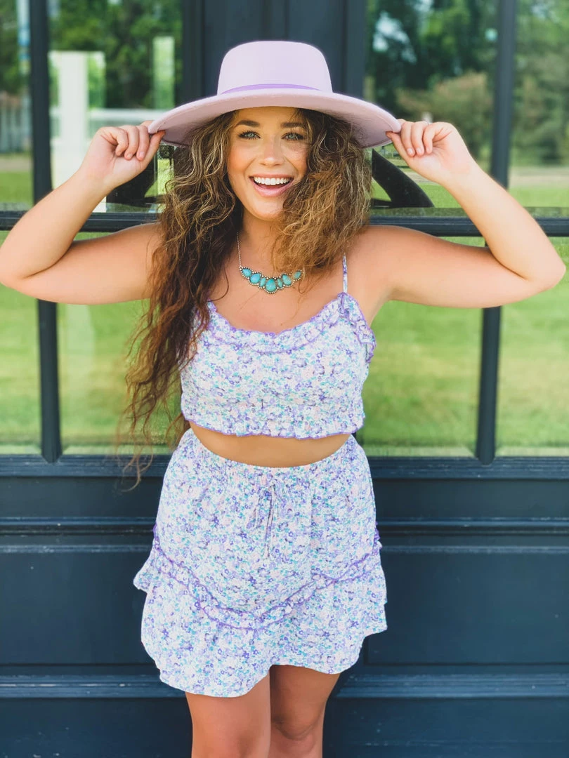 Beautiful lavender floral two piece set will have you obsessed. Set features a lavender floral crop top and a lavender floral skirt. Top features a cropped length, lettuce trim detail, adjustable spaghetti straps, and a super stretchy elastic band made for comfort. Skirt features an elastic stretchy waistband, a faux drawstring, a lettuce trim detail, and a light weight material. Perfect set for brunch or having lunch with the girls. Easily pair the crop top with your favorite pair of denim shorts or bell bottoms! The skirt also looks perfect with your favorite graphic tees!