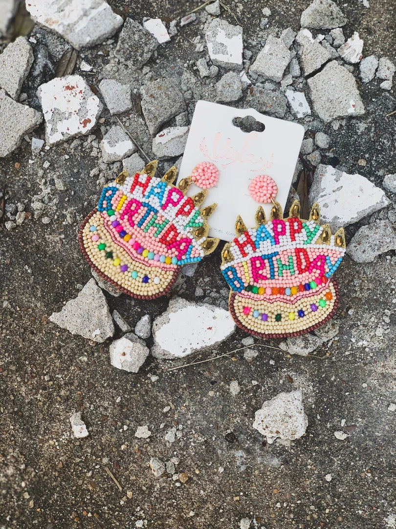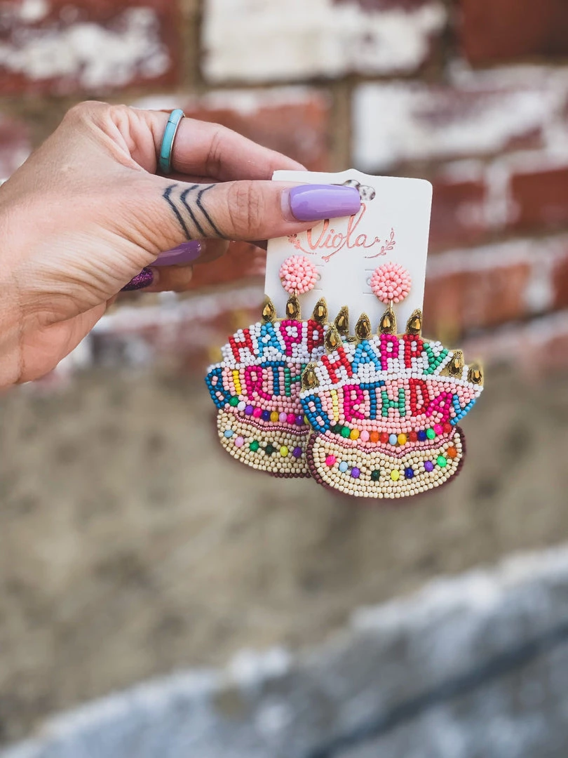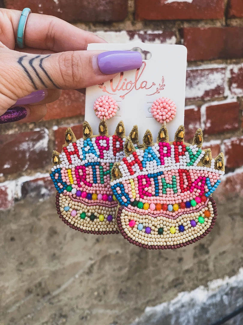 - Fully beaded colorful “Happy Birthday” birthday cake earrings, beaded candles