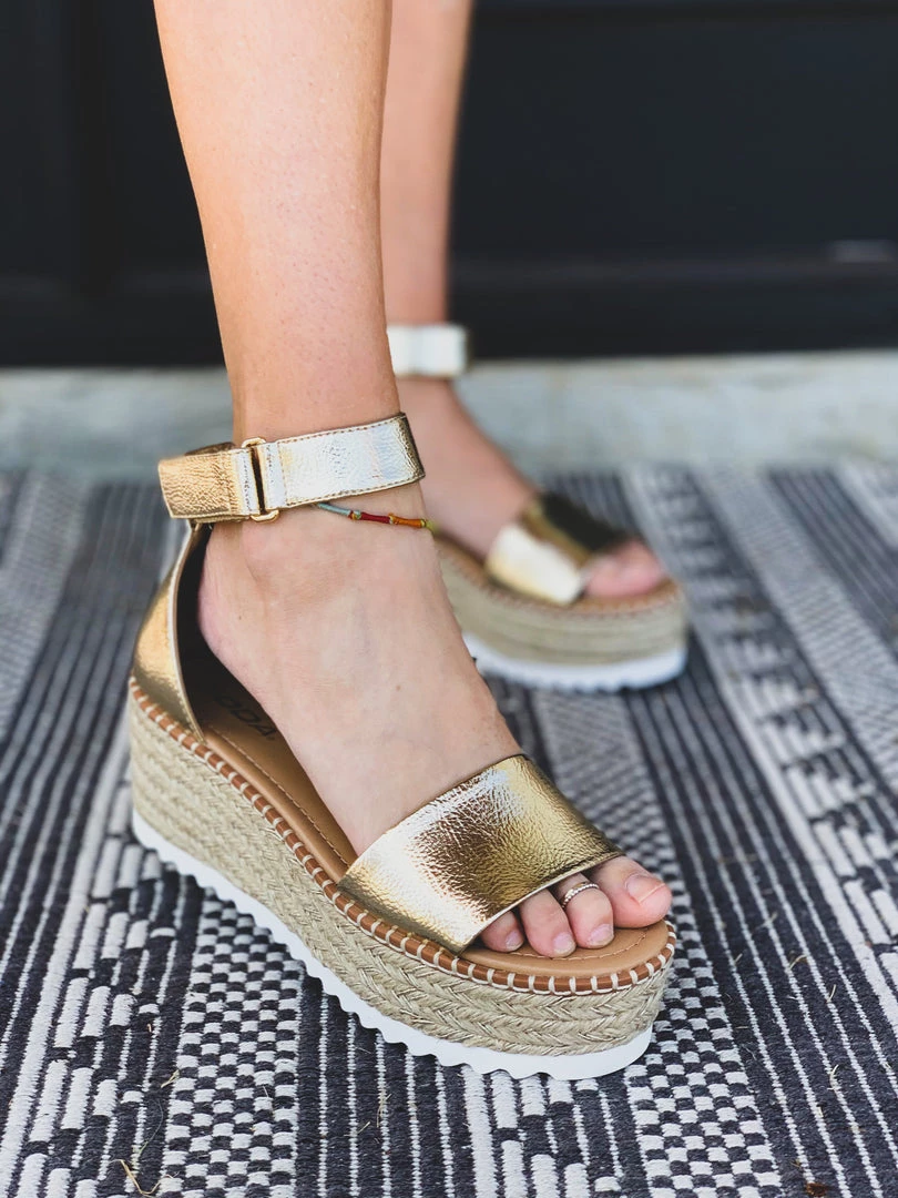 Metallic gold sandals feature a espadrille wedge platform with gold metallic weaved throughout. Wedges have one single wide toe strap, gold metallic ankle strap with Velcro closure. Such a cute shoe to pair with all your denim shorts and dresses!