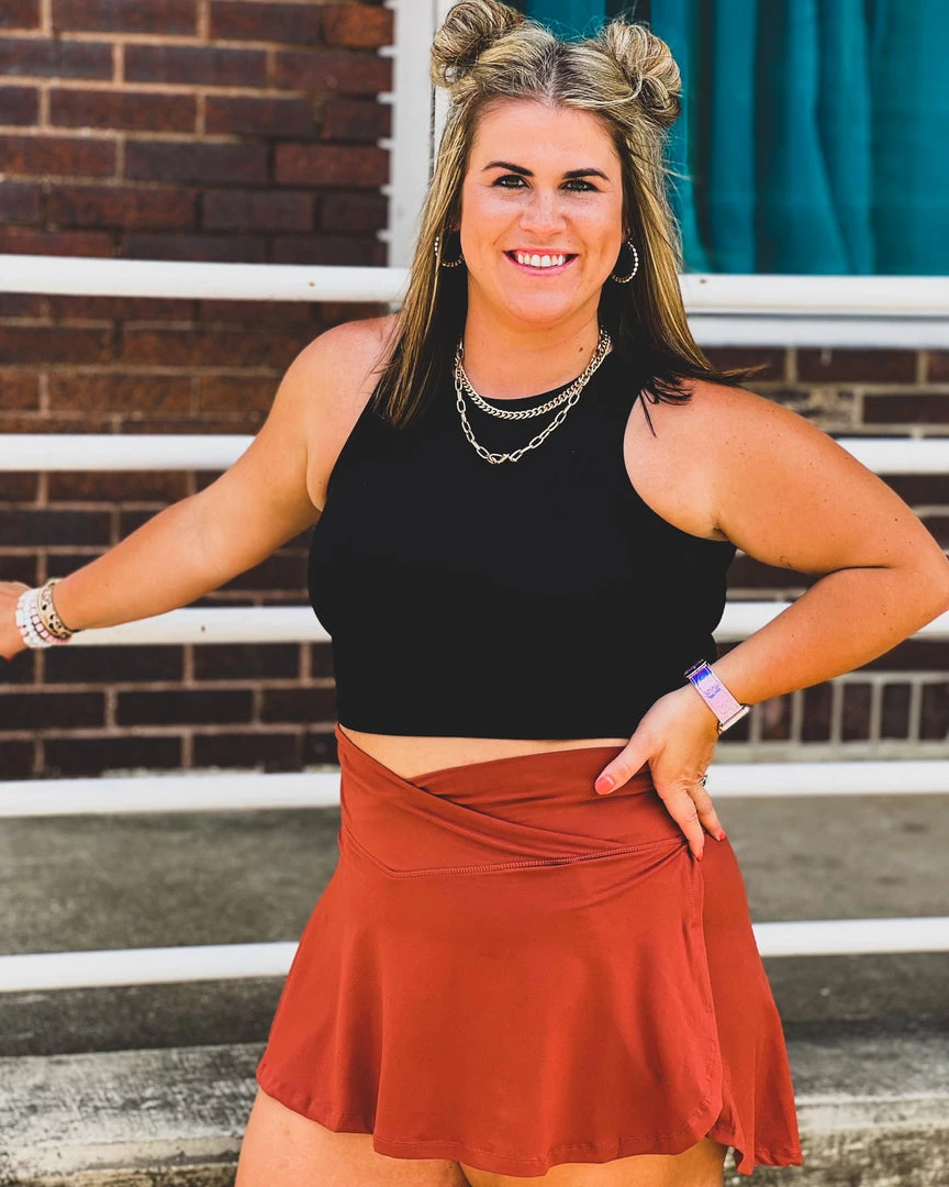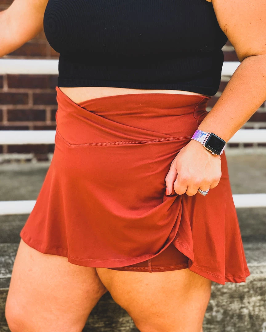 - Famous deep terracotta athleisure 2-in-1 skirt we all have been going crazy over